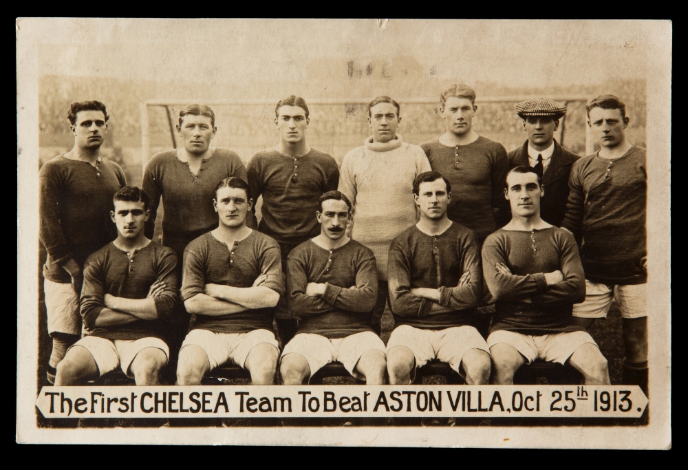 Two Chelsea FC team-group postcards from season 1913-14, the first card featuring the full squad; the other titled ''the first Chelsea football team to beat Aston Villa Oct. 25th 1913''