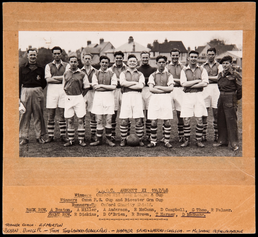 A pre-professional career photograph of Tommy Harmer taken in 1947-48 the season before he signed for Tottenham Hotspur, Harmer is depicted in a team-line up for R.A.O.C. Arncott XI, winners of the Oxford Mid Week League & Cup , Oxon P.S. Cup and Bicester Grn Cup, Harmer stands in the first row second from the right, mounted with typescript details, overall 28 by 22cm.