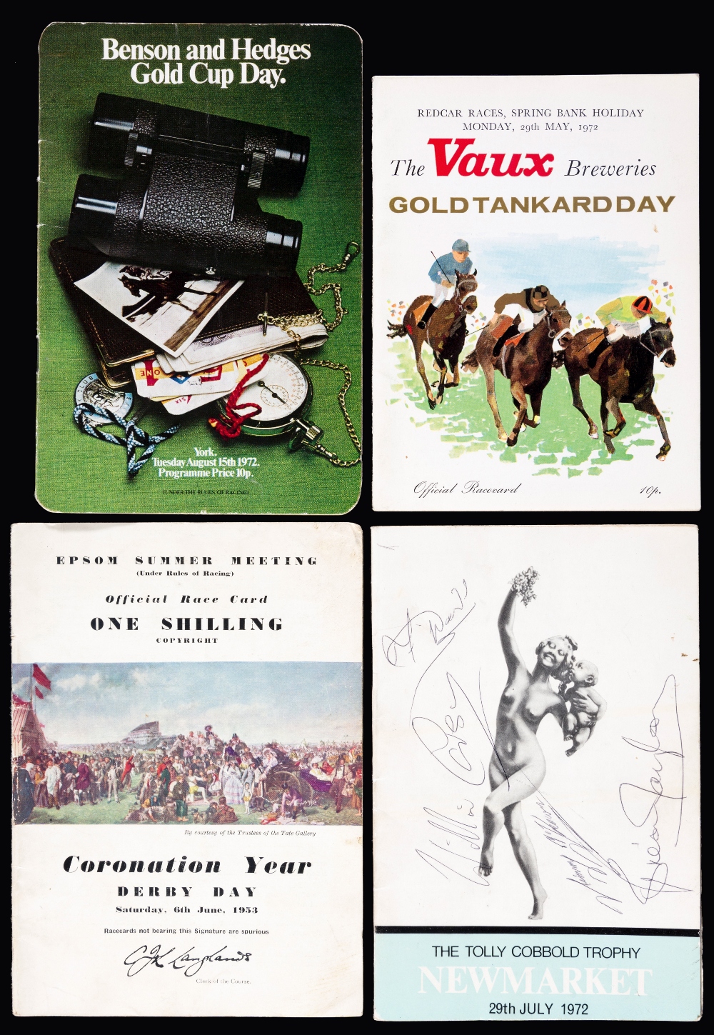14 racecards including the 1953 Derby won by Pinza and the 1972 B&H Cup won by Roberto, also including a 1972 Newmarket Tolly Cobbold Day card signed