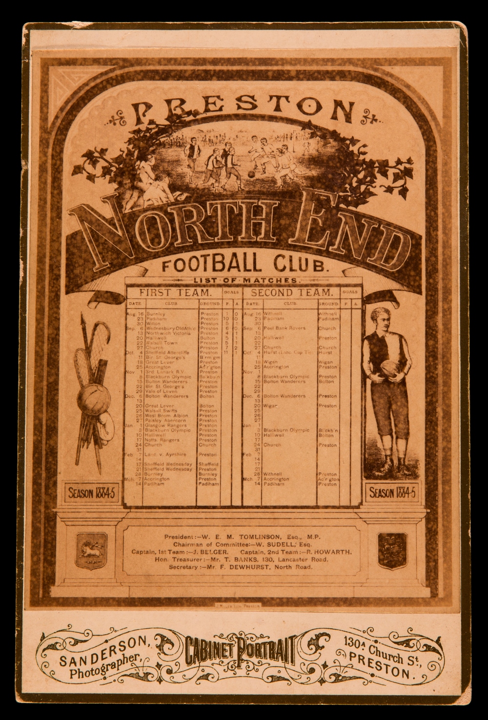 Preston North End Football Club fixture list for season 1884-85, in the form of a cabinet card published by Sanderson Gallery of Art and Photographers