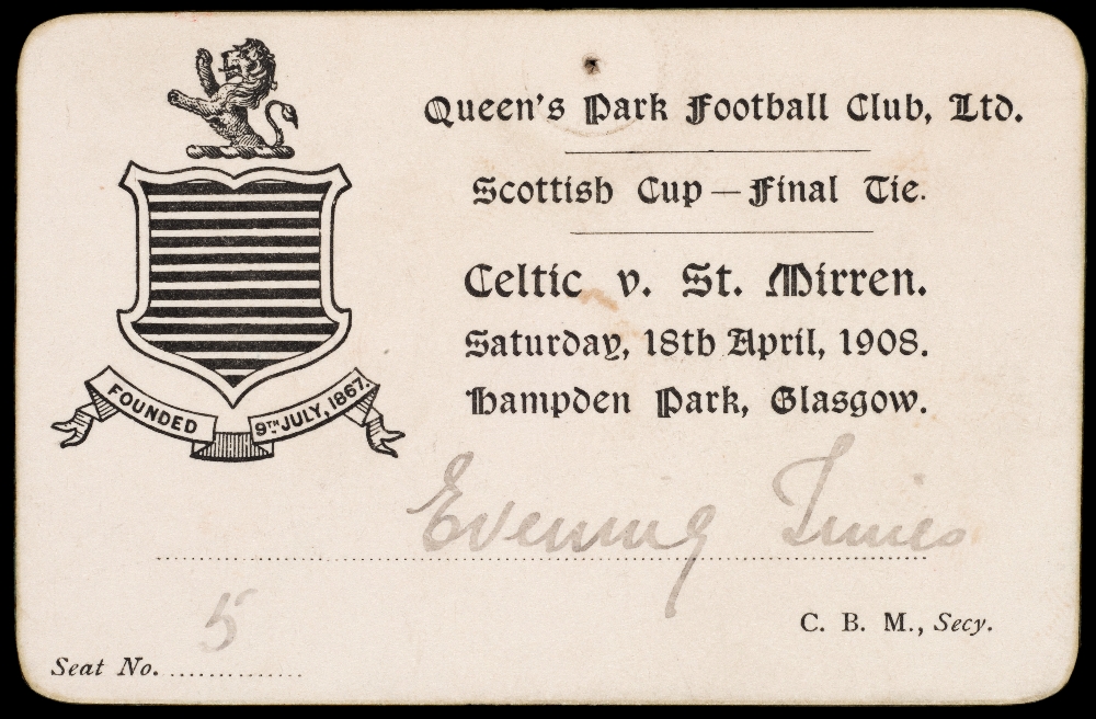 A scarce and early Scottish F.A. Cup Final ticket Celtic v St Mirren played at Hampden Park 18th April 1908, issued to the [Glasgow] Evening Times for Seat No.5 Celtic beat St Mirren 5-1 with goals by Bennett (2), Hamilton, Somers & Quinn. Cunningham scored a consolation goal for St Mirren.