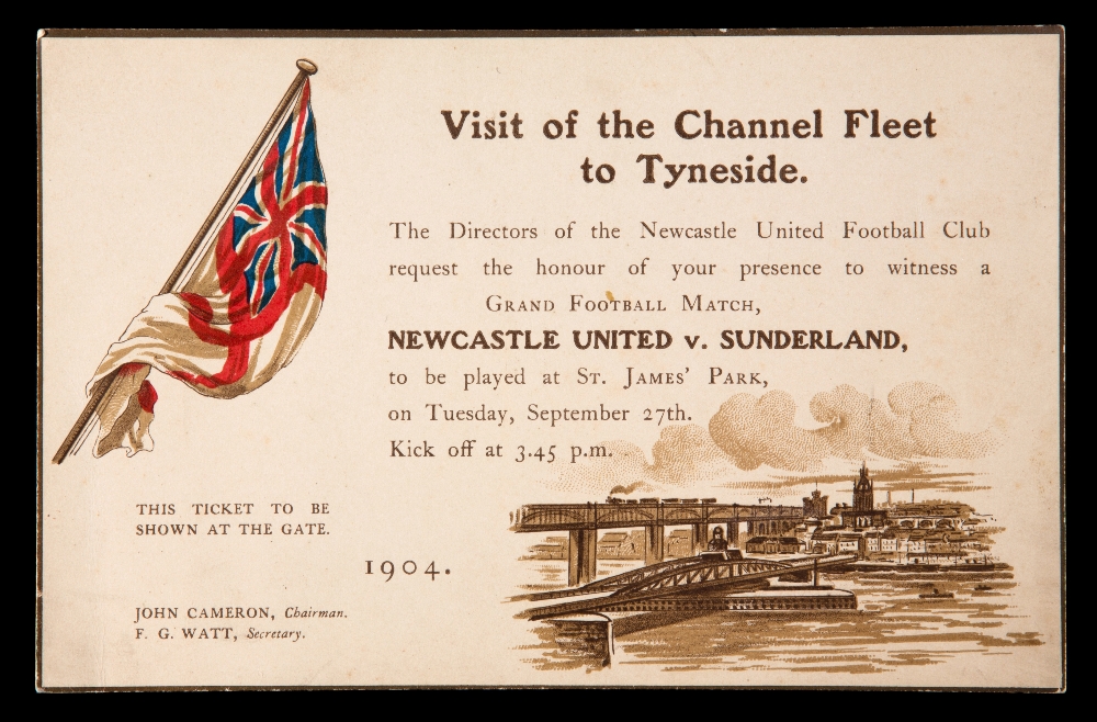A scarce ticket for the Newcastle United v Sunderland Grand Football Match played at St James' Park 27th September 1904, the match commemorating the Visit of the Channel Fleet to Tyneside with the game being kicked-off by Admiral Lord Beresford, the ticket by invitation of the Newcastle United FC club directors Newcastle United won the match 2-1.
