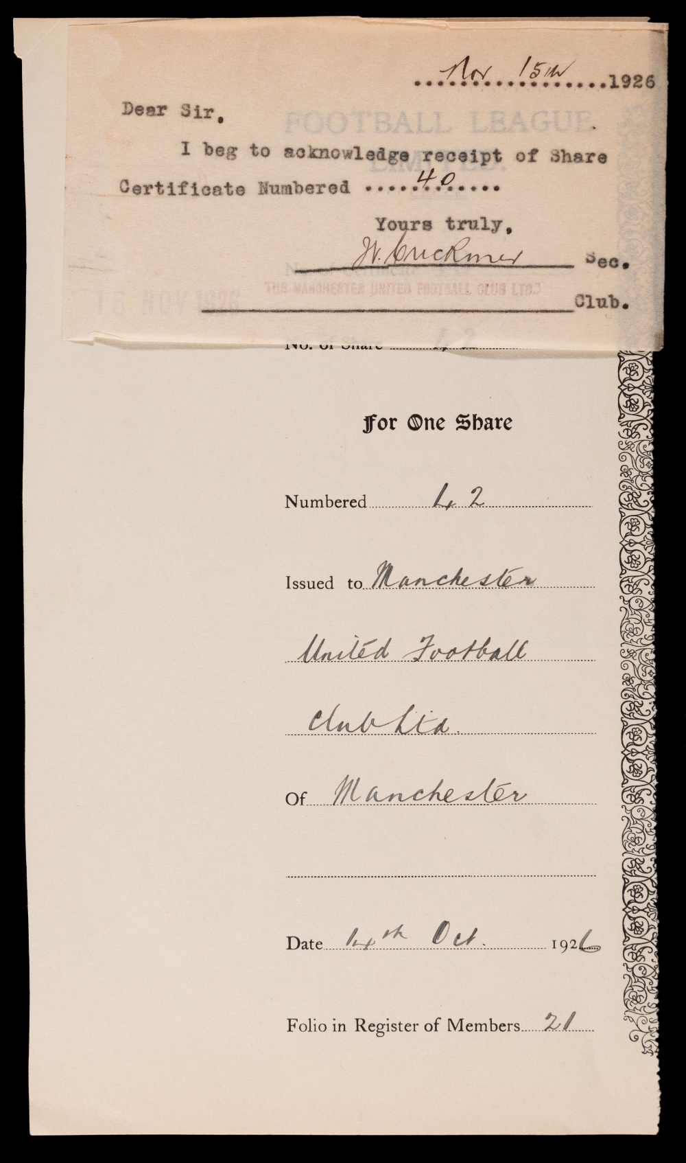 1926 Football League share certificate acknowledgement signed by Manchester United secretary 14th October 1926 One week earlier the Football Associat