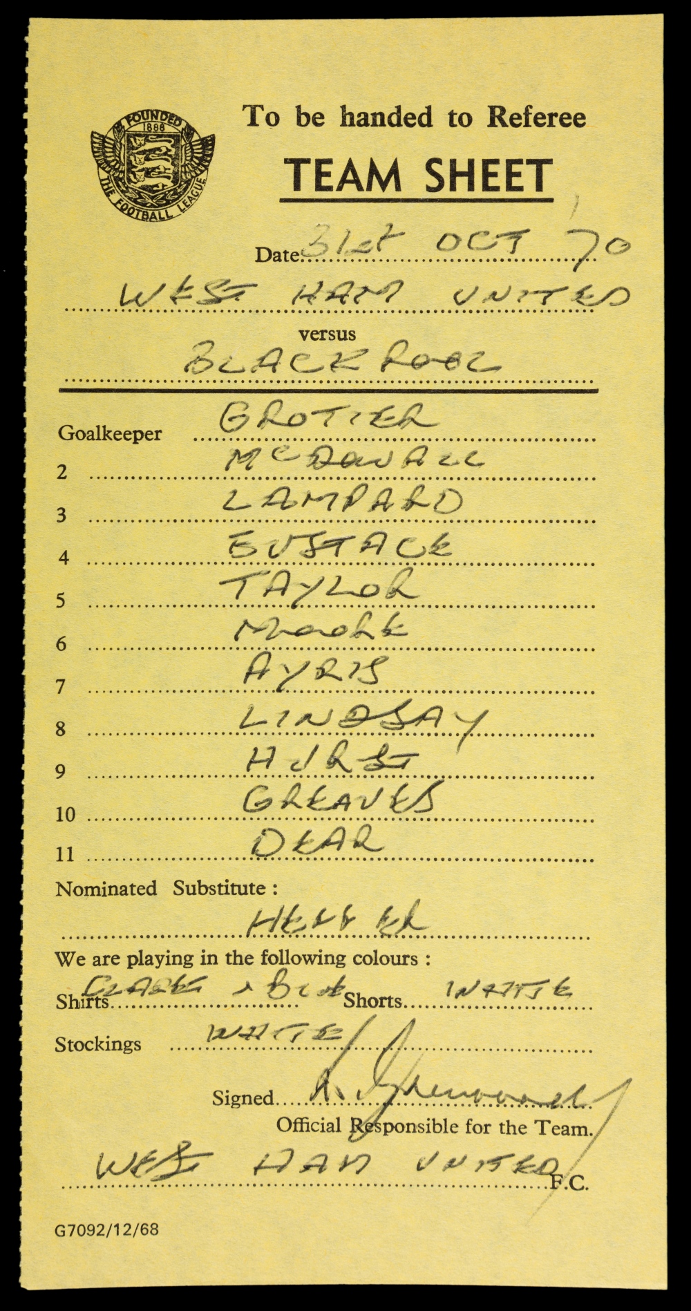 Official Football League team sheet: West Ham United v Blackpool 31st October 1970, hand-written West Ham line-up, confirmation of playing colours and