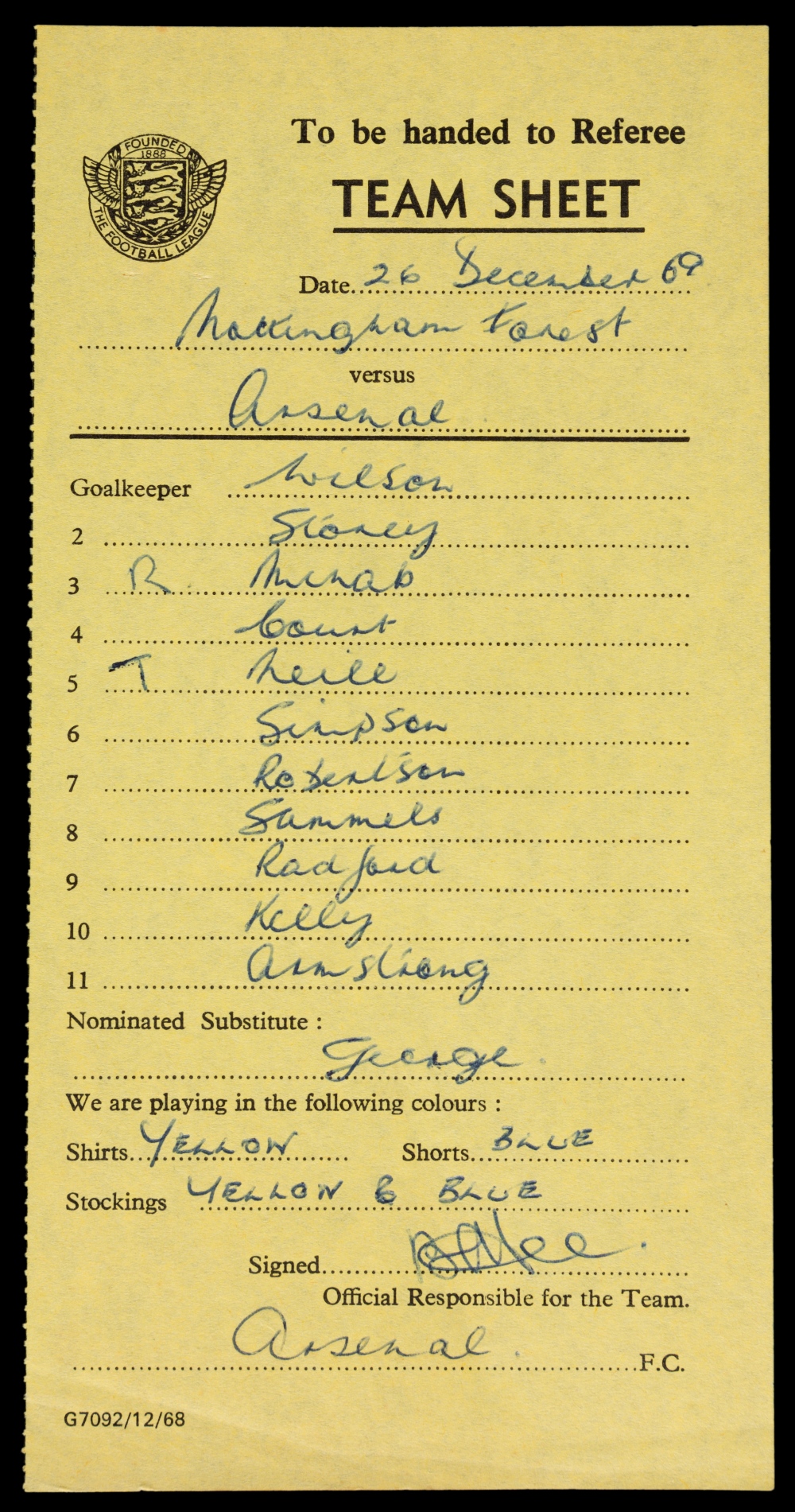 Official Football League team sheet: Nottingham Forest v Arsenal 26th December 1969, hand-written Arsenal line-up, confirmation of playing colours and