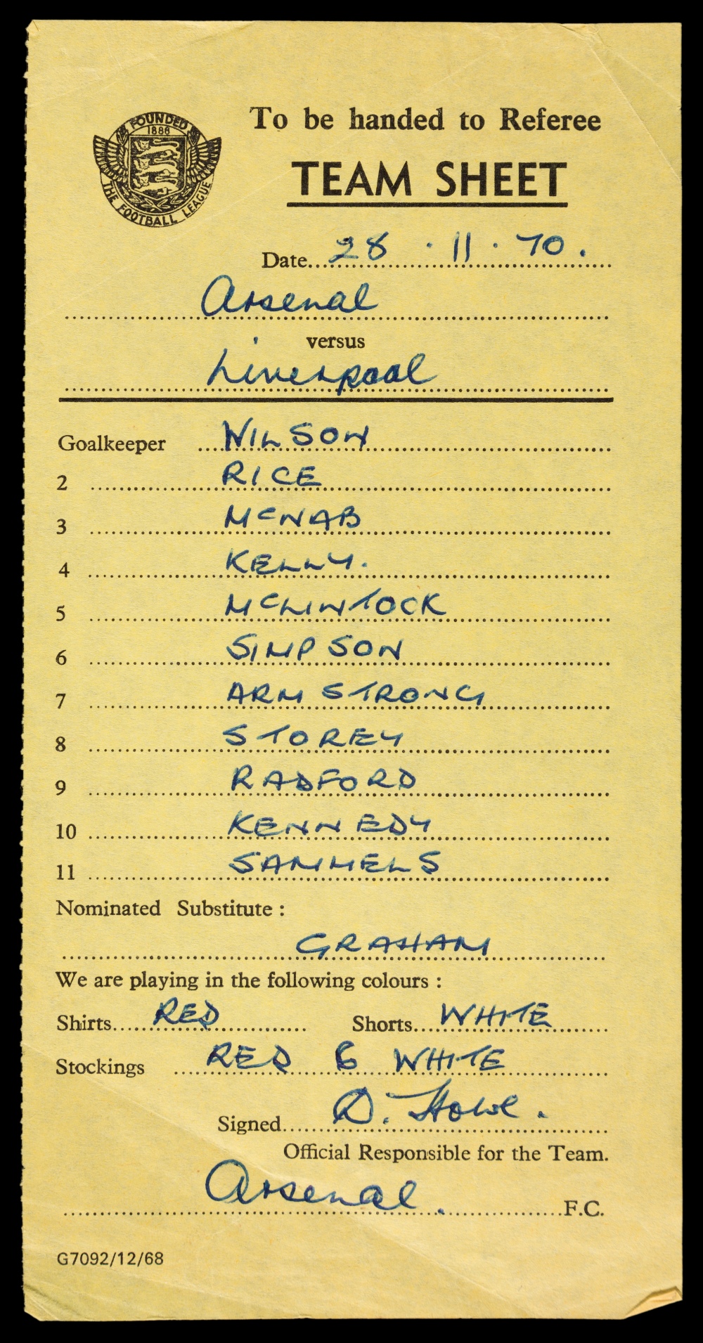Official Football League team sheet: Arsenal v Liverpool 28th November 1970, hand-written Arsenal line-up, confirmation of playing colours and signed-