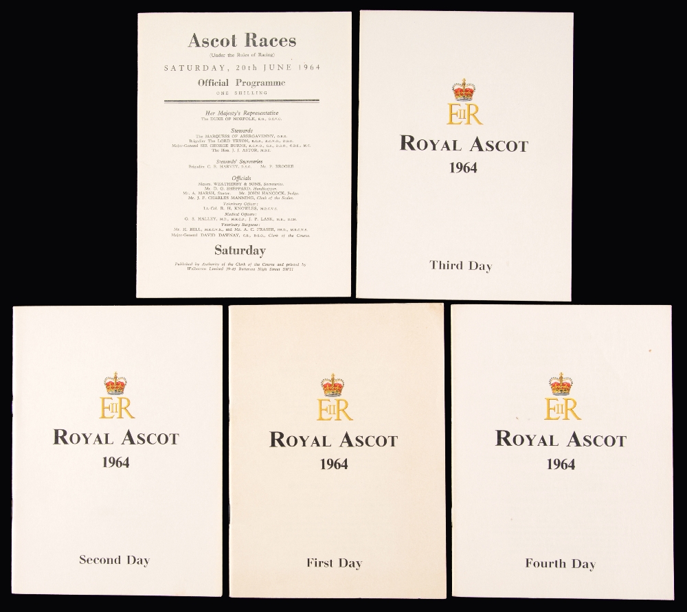 A rare full set of five 1964 Royal Ascot racecards, including the scarce issues for the abandoned third & fourth days due to a waterlogged course, the Saturday Heath Meeting card featuring eleven races and a walk-over (Queen Alexandra) due to the rescheduling of selected major races from the Royal Meeting lost to the weather on 18th & 19th June including the Gold Cup, the Friday card had previously been expanded to ten races after the loss of the 3rd day's racing