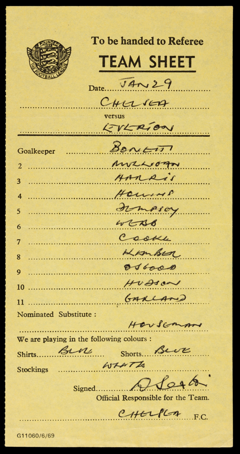 Official Football League team sheet: Chelsea v Everton 29th January 1972, hand-written Chelsea line-up, confirmation of playing colours and signed-off