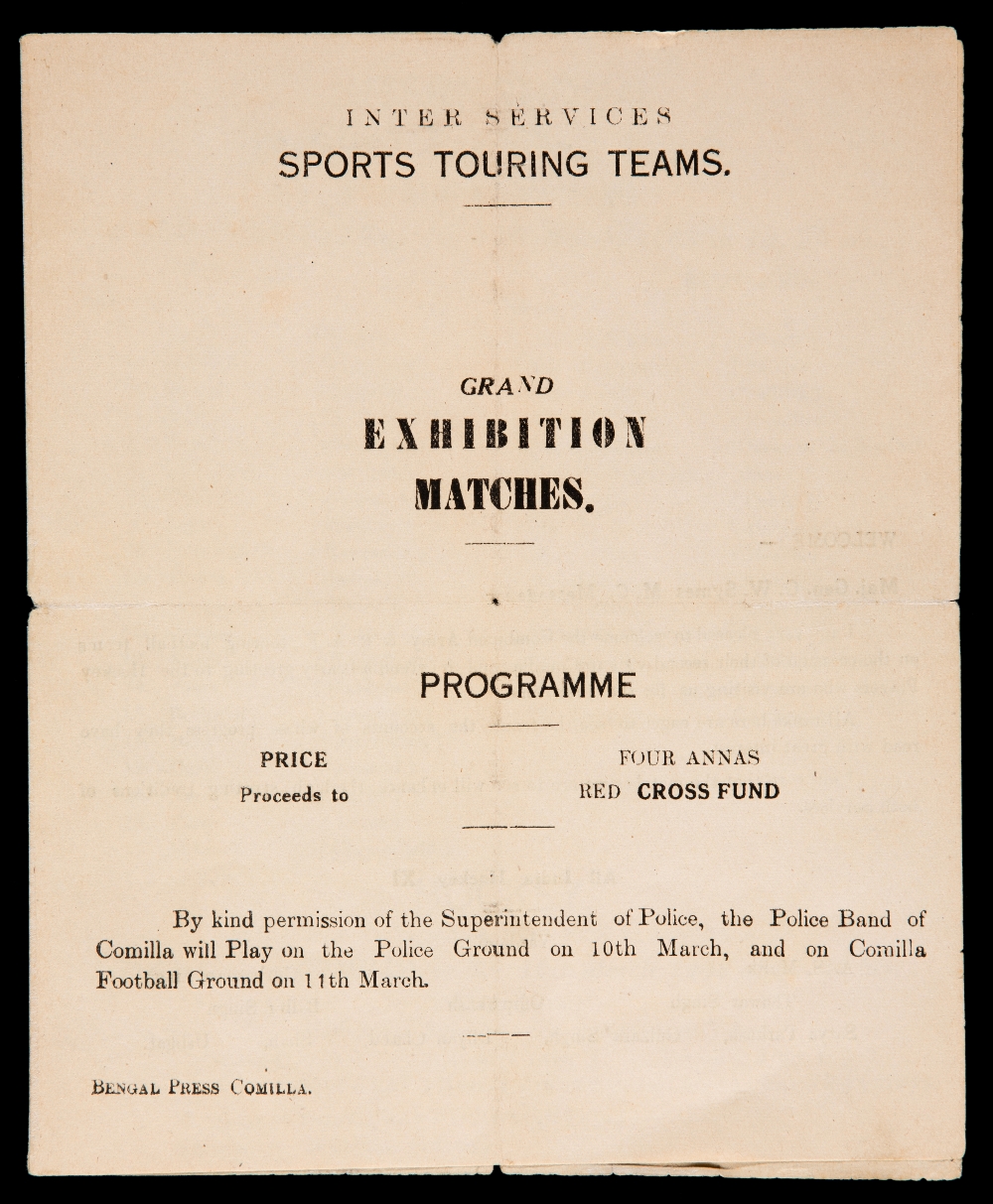 Wartime England v Scotland international exhibition match programme played at Mynamatti, India, 10th March 1943, Ted Ditchburn in goal for England, all players in the professional game, in aid of the Red Cross Fund, also two other matches on the same day Army v England & RAF v Scotland, plus a field hockey match, 4-pager, reasonably good, v & h folds
