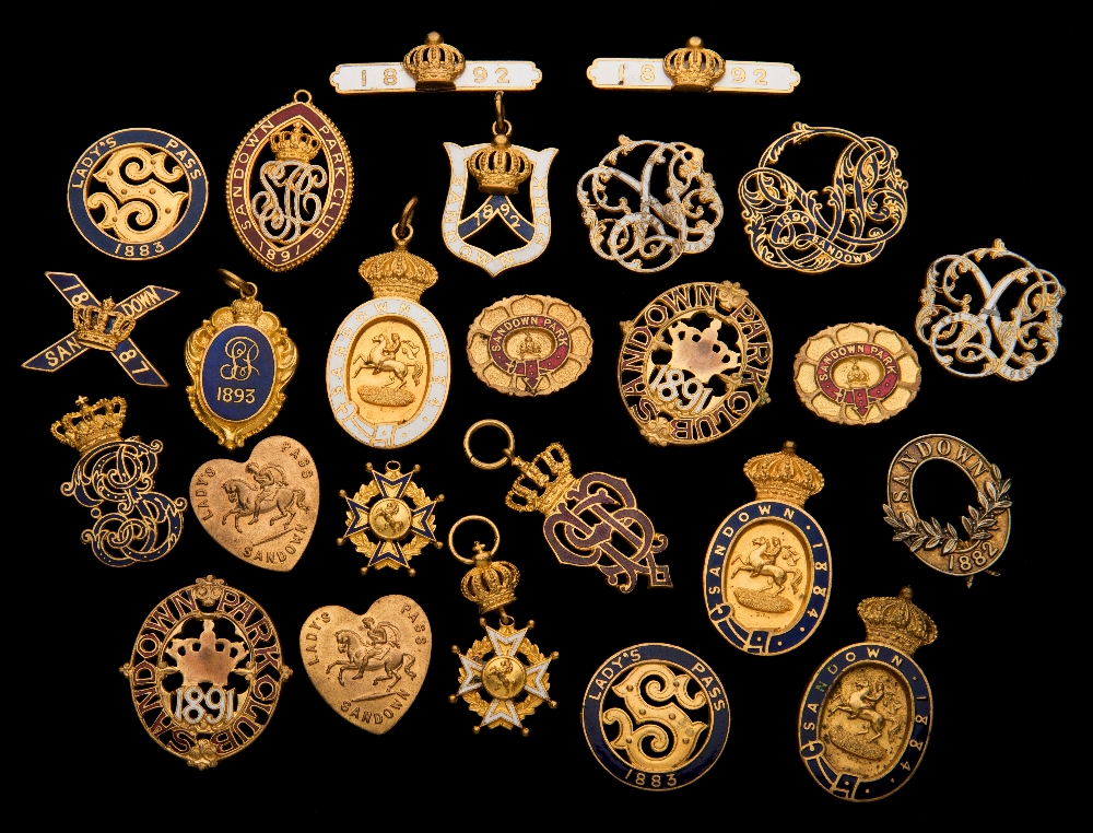 Nine Sandown Park Member's metal race badges, comprising 1882 (Lady's), 84, 86, 90, 91, 92, plus three undated including one Lady's (heartshaped) THIS ILLUSTRATION IS FOR LOTS 123, 124 & 125.
