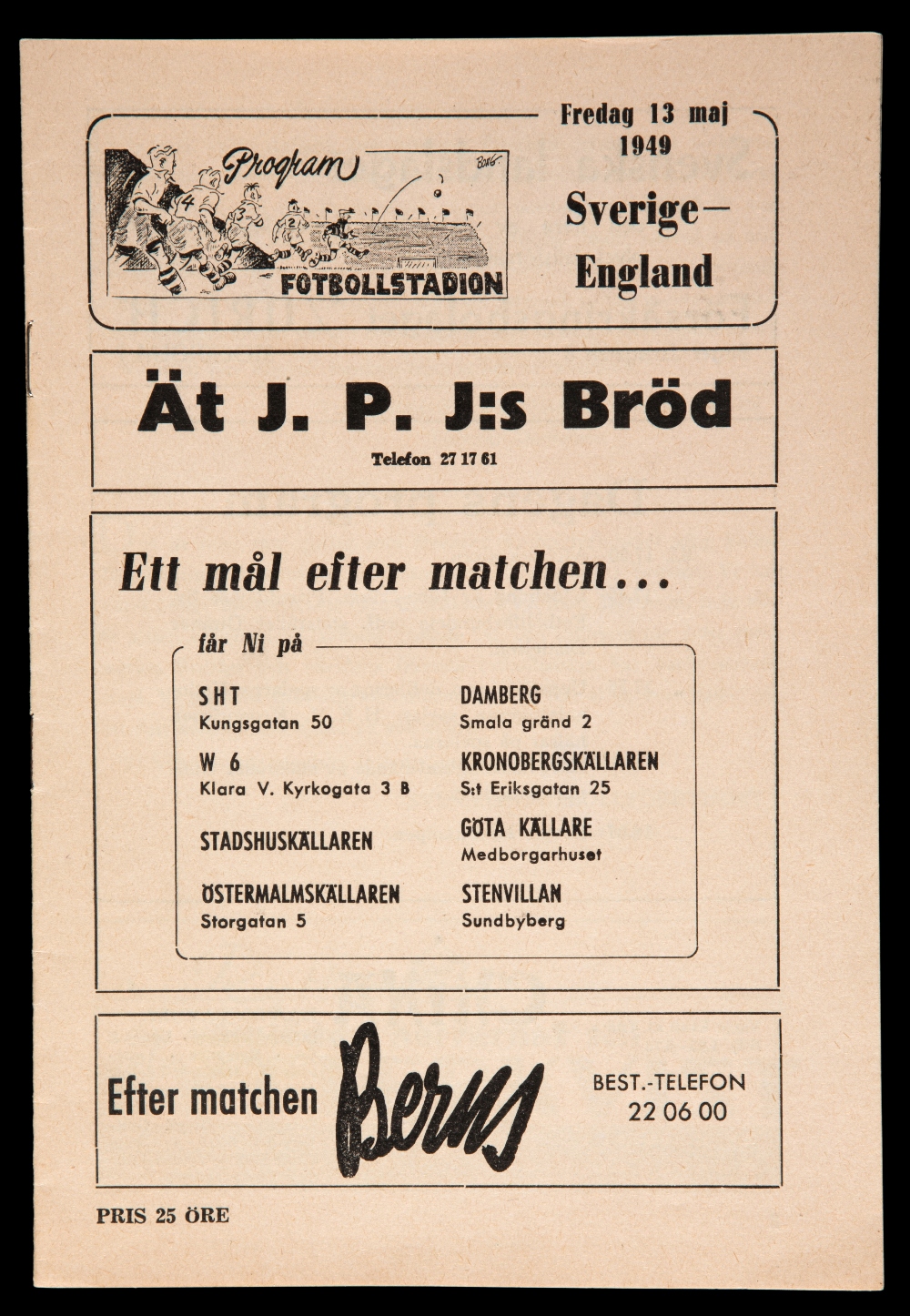 Sweden v England international programme played at the Rasunda Stadium, Solna, 13th May 1949, good condition