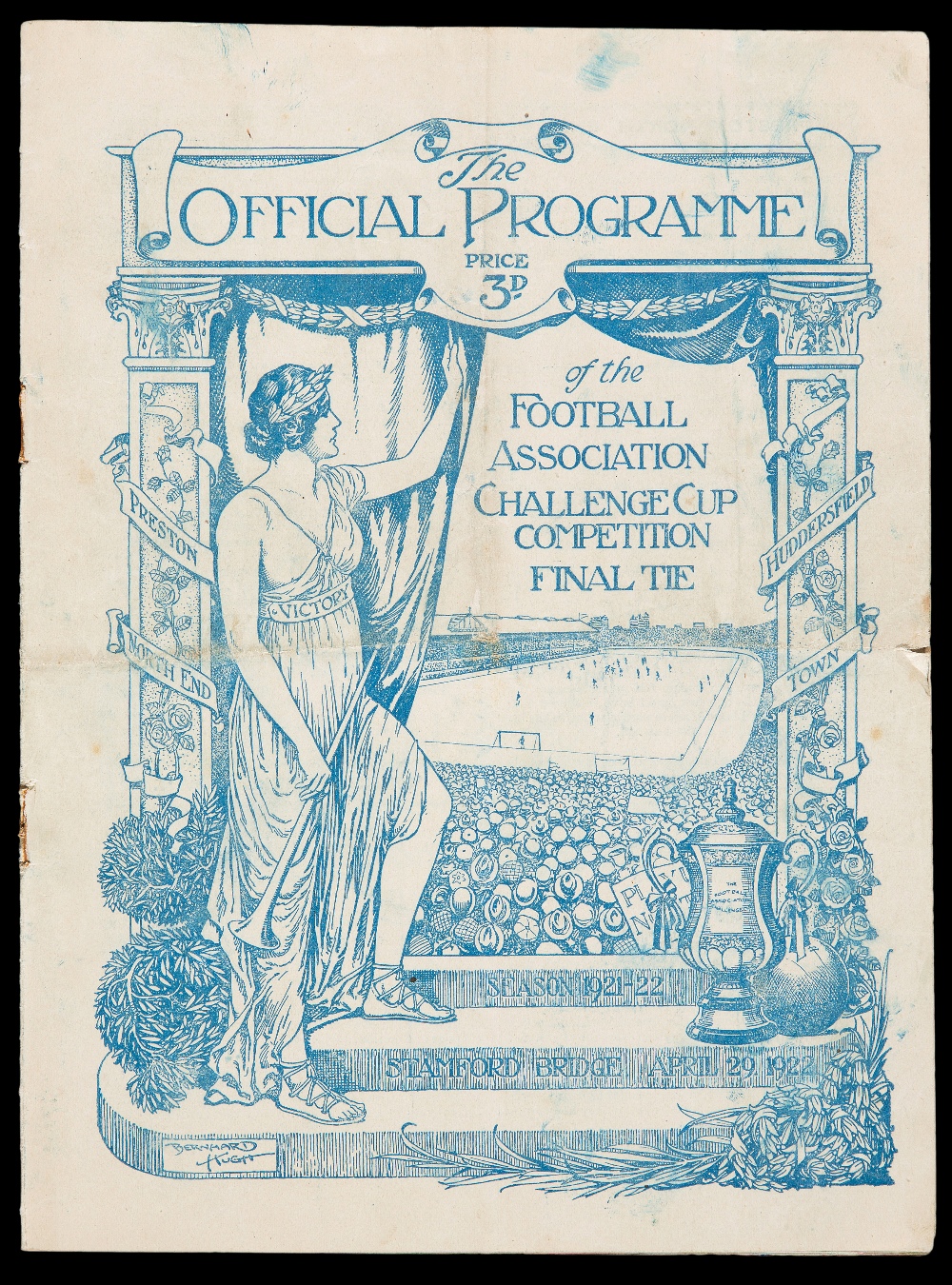 F.A. Cup Final programme Huddersfield Town v Preston North End played at Stamford Bridge 29th April 1922, staples removed, fair condition