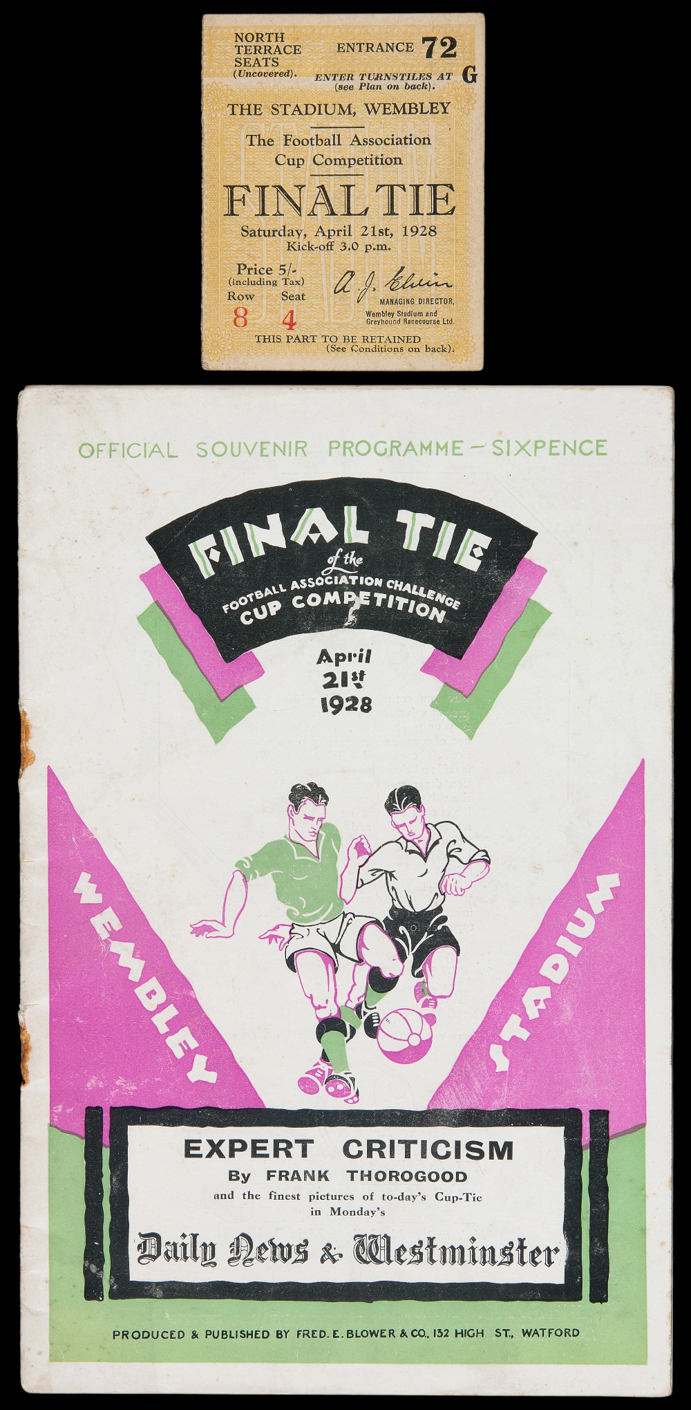 F.A. Cup Final programme Blackburn Rovers v Huddersfield Town 21st April 1928, staples removed, reasonably good condition; sold together with a ticket, good condition (2)