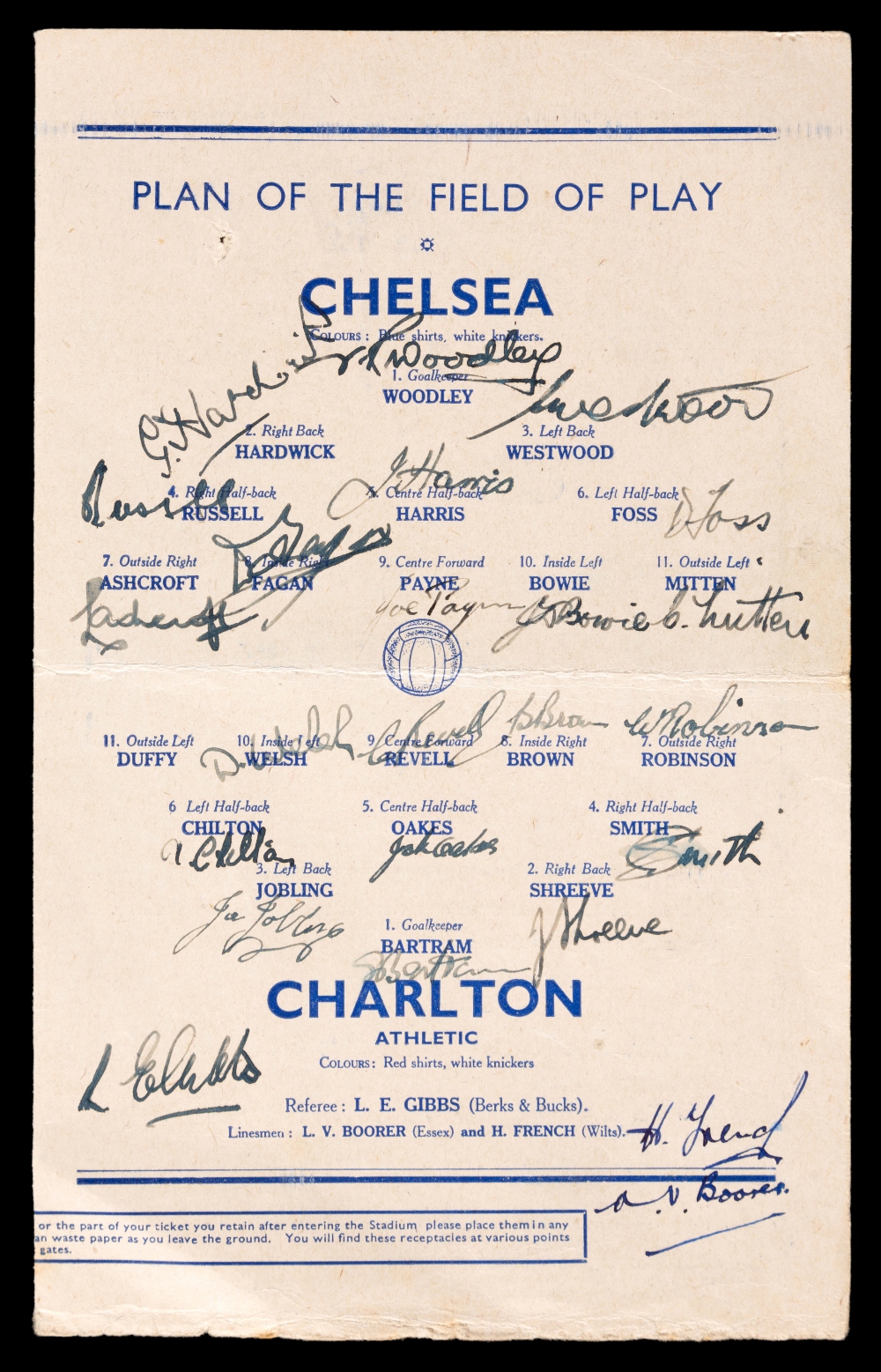 Fully-signed Chelsea v Charlton Football League (South) War Cup Final programme played at Wembley 15th April 1944, signatures in ink on the line-up pa
