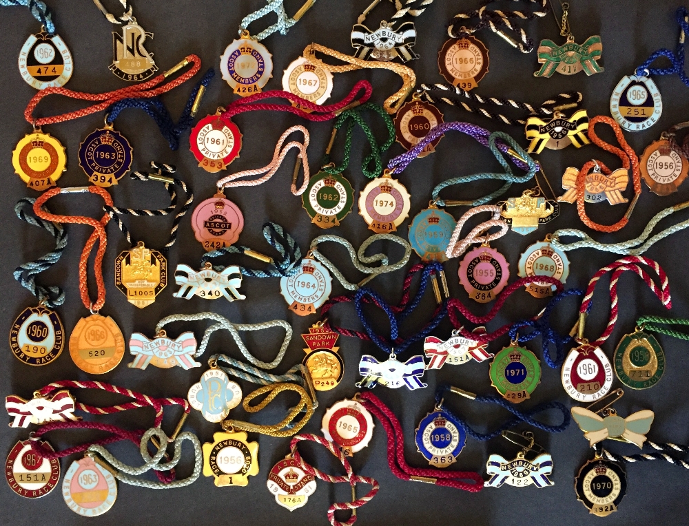 A collection of 45 enamelled members horse Racing badges, all with original rope strings or pins attached, comprising: Ascot, 1951, 1952, 1955, 1956, 1958, 1959, 1960, 1961, 1962, 1963, 1964, 1965, 1966, 1967, 1968, 1969, 1970, 1971, 1972, 1974, Hurst Park 1951, 1951 (Ladies), Newbury 1956, 1956 (Ladies), 1959, 1959 (Ladies), 1960, 1960 (Ladies), 1961, 1961 (Ladies), 1962, 1962 (Ladies), 1963, 1963 (Ladies), 1964, 1964 (Ladies), 1965, 1965 (Ladies)1966, 1966 (Ladies), 1967, 1967 (Ladies), Sandown Park 1951, 1951 (Ladies), 1952 (45)
