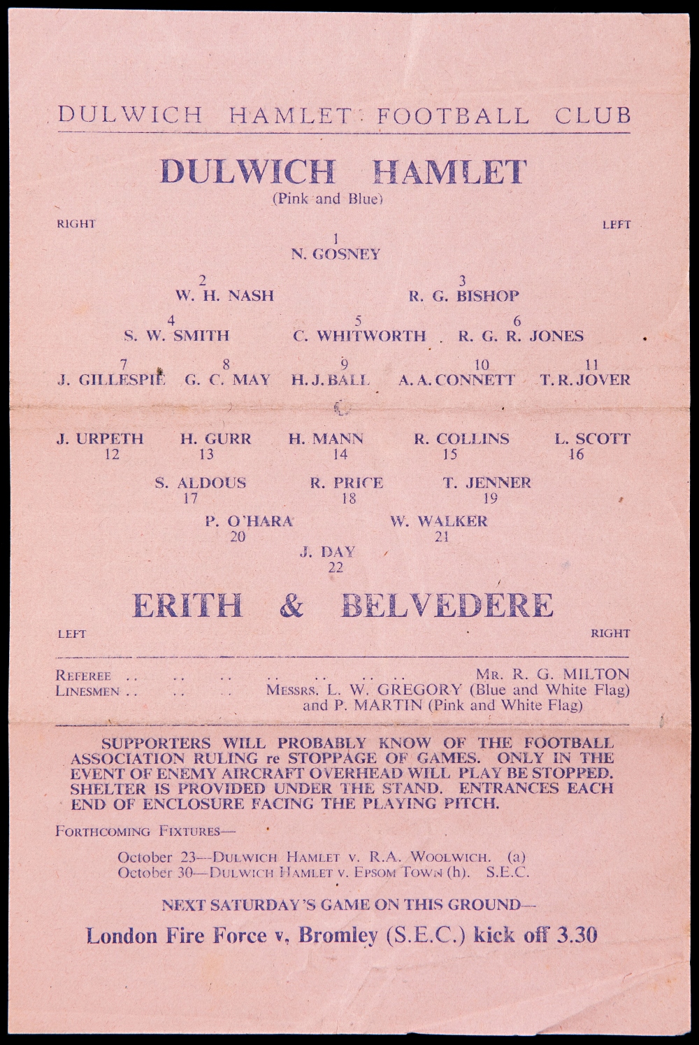 23 Dulwich Hamlet home programmes season 1943-44, including fixtures v Erith & Belvedere, Sutton & Tooting, plus London Fire Forces v Charlton Rovers, all have folds, but generally fair to good