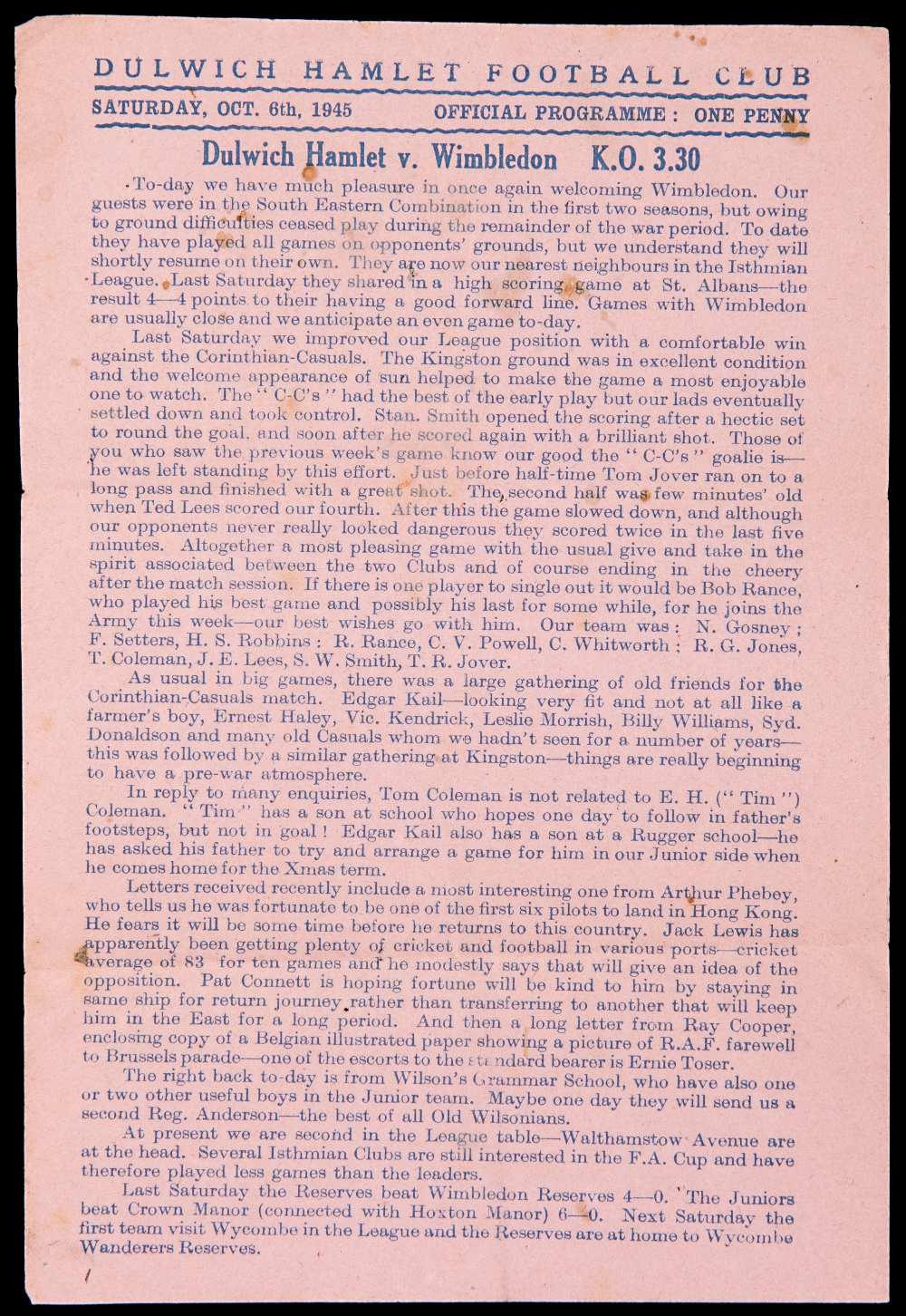 16 Dulwich Hamlet home programmes season 1945-46, including fixtures v Wimbledon, Oxford v Cambridge and Romford in the F.A. Cup, all have folds, but