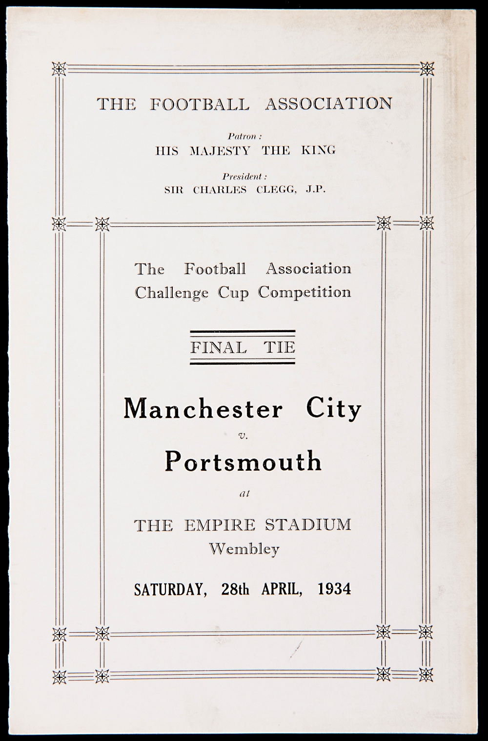 Dignitaries edition of the Manchester City v Portsmouth 1934 F.A. Cup Final programme, four-pager printed on stiff card