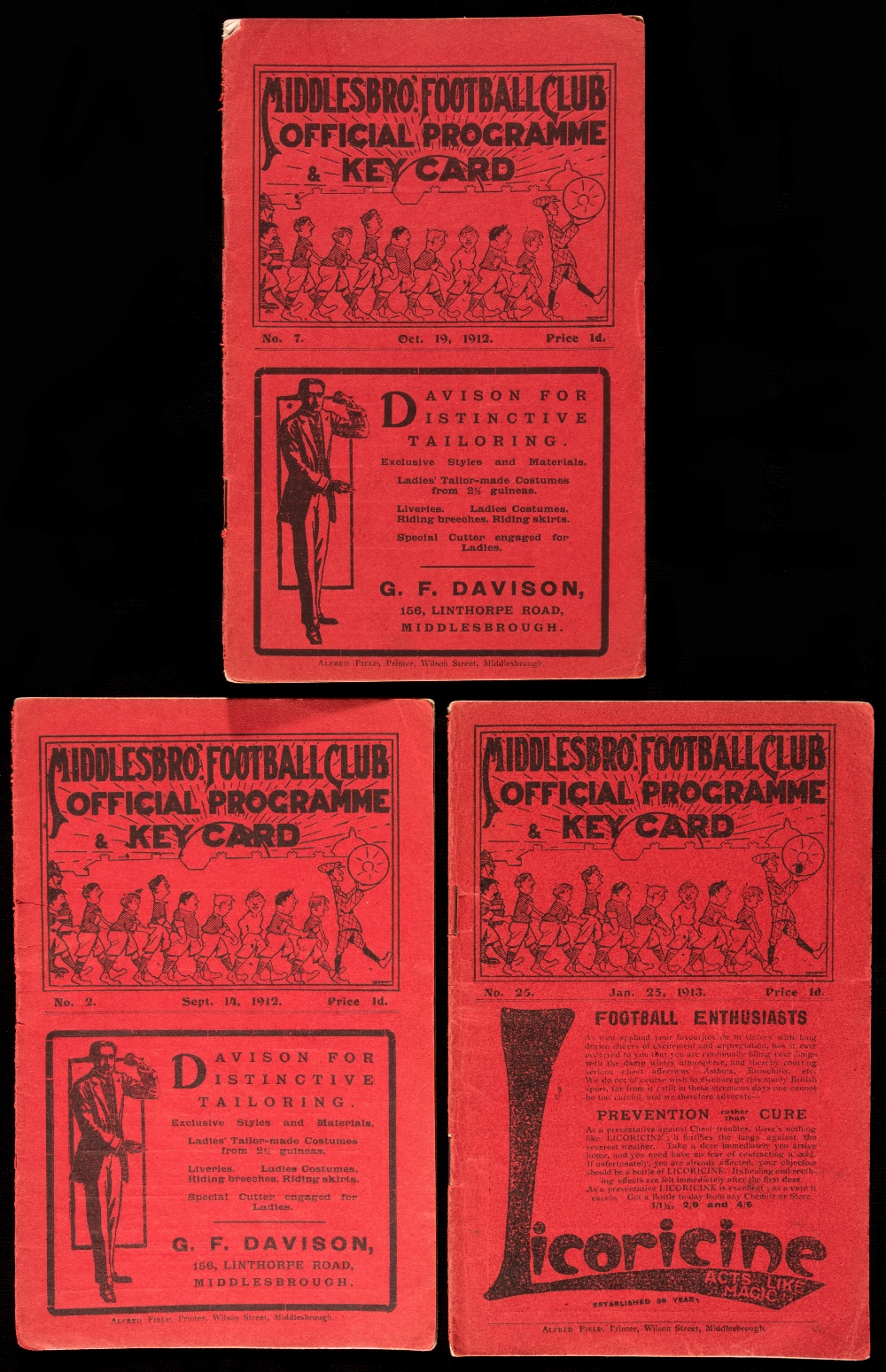 Middlesbrough v Derby County programme 25th January 1913, together with two 'Boro reserves programmed from the same season v West Stanley first-team &