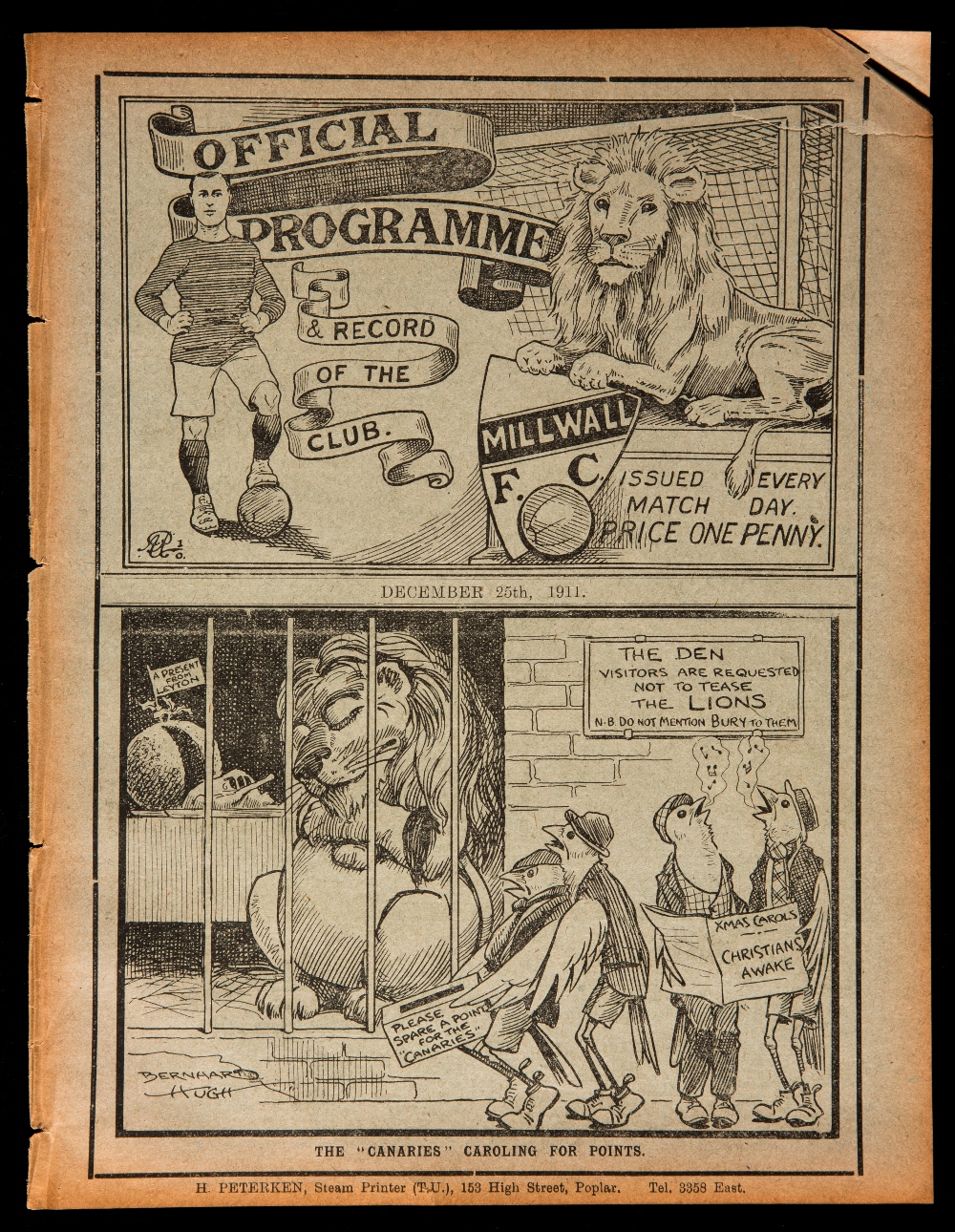 Millwall reserves v Crystal Palace reserves programme Kent League 25th December 1911, ex-bound volume, some slight tears at top right-hand corner, otherwise generally good with no writing