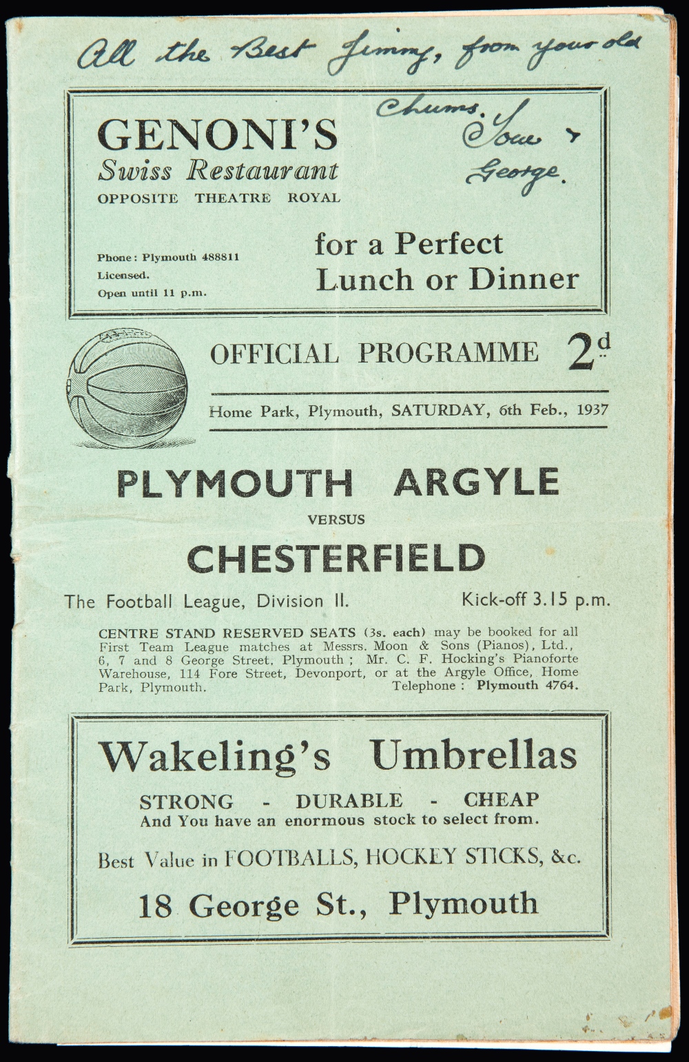 Plymouth Argyle v Chesterfield programme 6th February 1937, light folds with writing on cover, otherwise generally good
