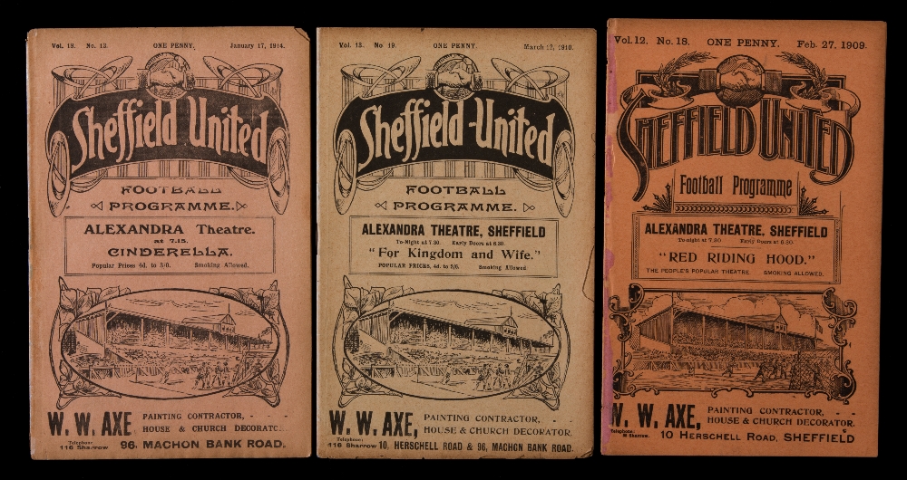 Six Sheffield United home programmes, v Bolton Wanderers 27th October 1900, Aston Villa 24th November 1900, Newcastle United 15.11.1902, Leicester Fosse 27.2.1909, and two v Bradford City 12.3.1910 & 17.1.14, all ex-bound volumes