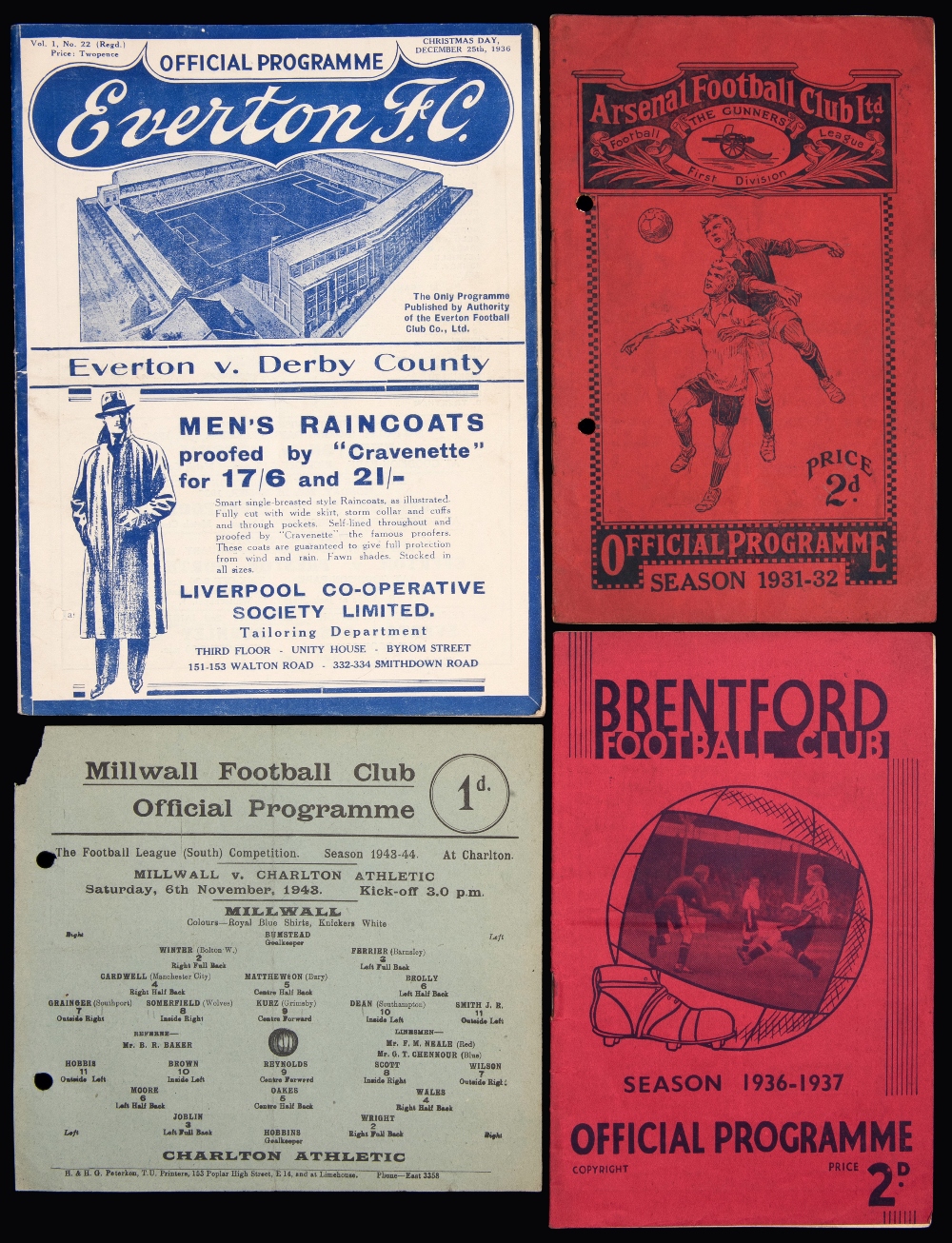A collection of 13 pre-war and wartime football programmes, Everton v Derby 1936/37, Arsenal v WBA 31/32 & Middlesbrough 37/38 (both punch-holed), the remainder wartimes (all punch-holed) 1943-44 & 44-45, homes for Millwall, West Ham & Tottenham, plus War Cup semi-final Chelsea v Reading at Spurs and England v Combined Servies at Chelsea