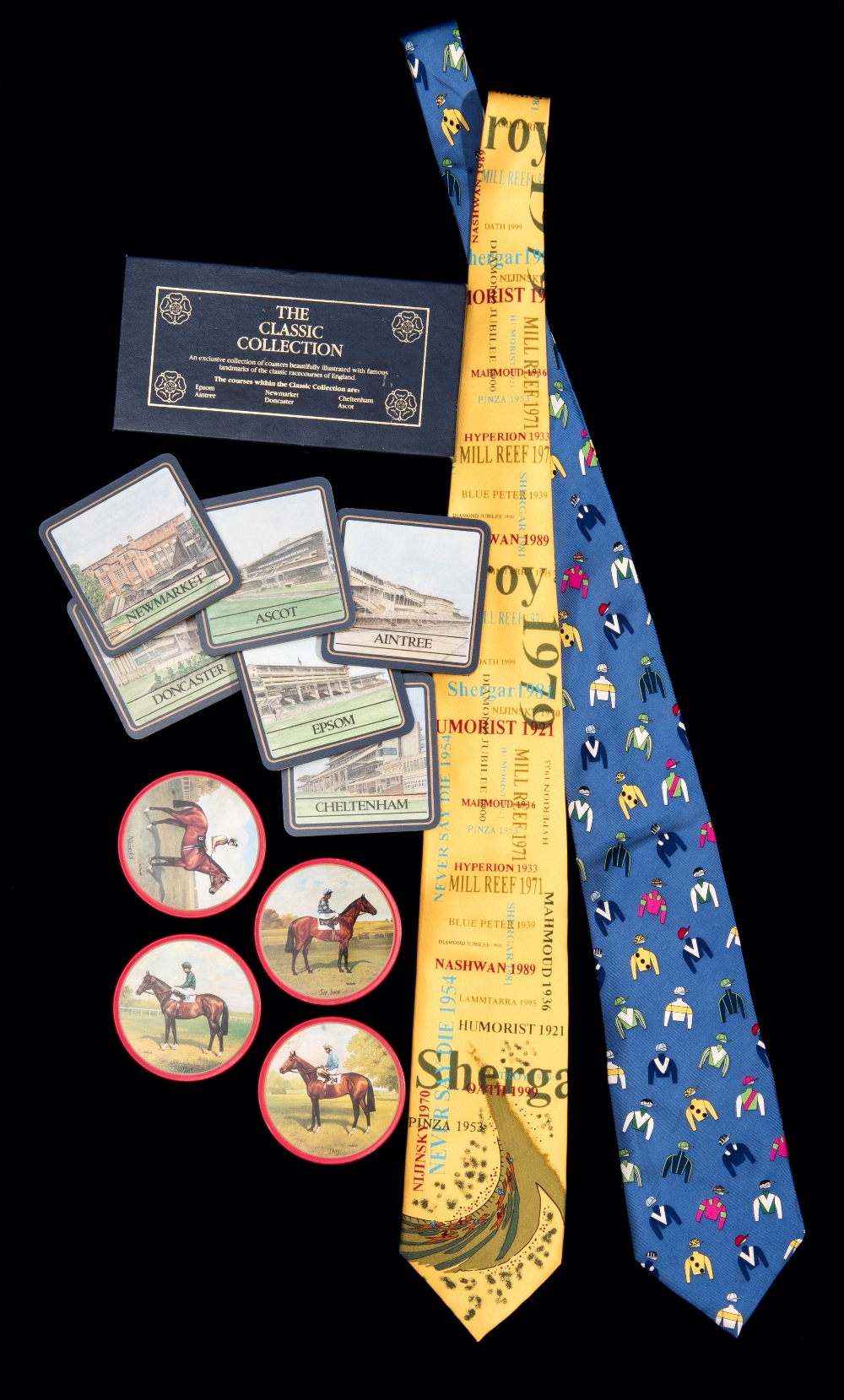 Large collection of modern racing memorabilia, including books, racecards, calendars, and other memorabilia, a little football content as well, the lot including many racing biographies, racecards including Cheltenham Gold Cup, Derby Oaks, Champions Day at Ascot, Breeders Cup; boxed Godolphin diary, silk ties, boxed set of coasters, statuette, ashtray, race badges; also some framed items including Max Brandrett signed artist drawn limited edition print, 717/850, featuring Kahyasi & Ray Cochrane winning the 1988 Derby, 58 by 77cm.