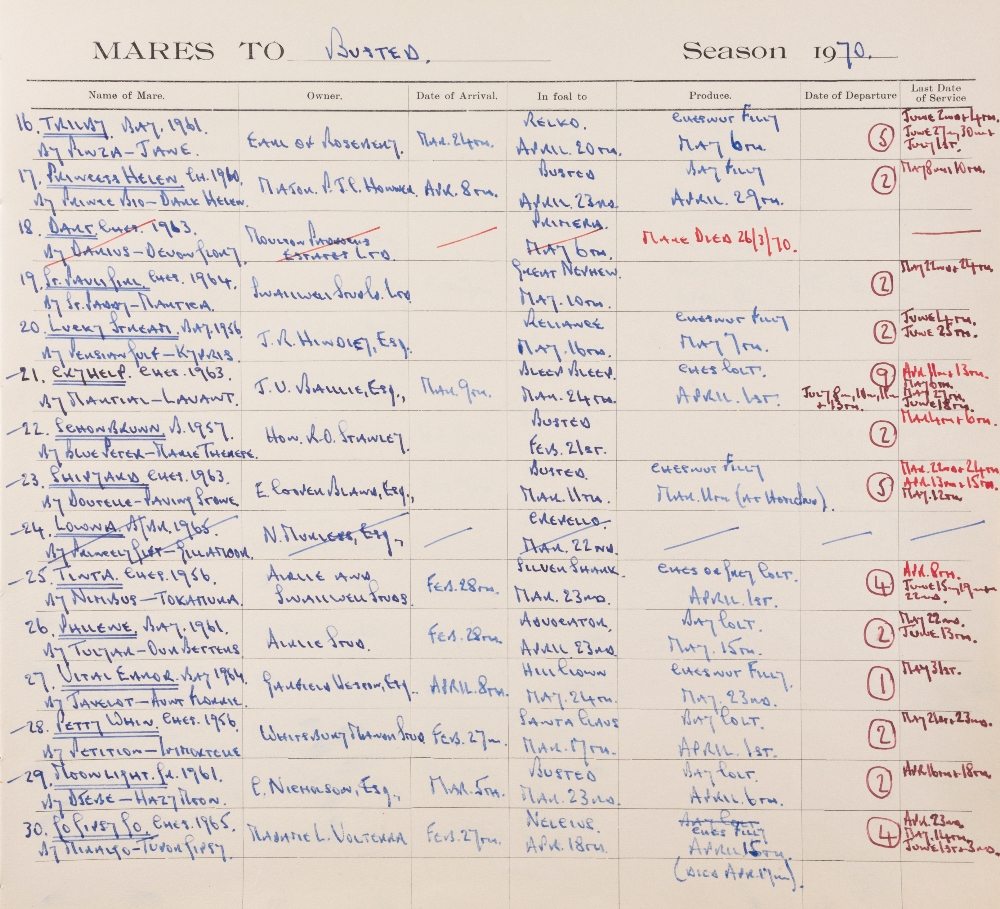 Hand written stud book for the Snailwell Stud at Newmarket 1967 to 1983, mostly compiled by the Stud Manager A.W. Earl who appears to have been superstitious as visiting order of mares skips the No.13 or is entered as 12A, the book is a comprehensive record of mares to the stallions Busted, Primera, Matador & Athens Wood, the book includes Busted's covering of the mare Shipyard in 1970 that produced Bustino,