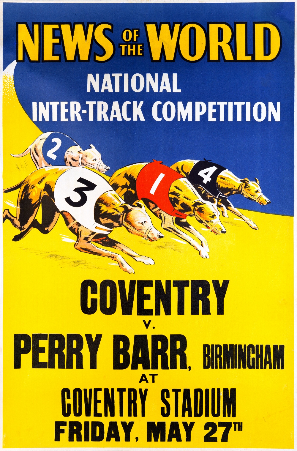 Vintage greyhound racing poster for the News of the World National Inter-Track Competition, Coventry v Perry Bar, 27th May but year unstated, 82 by 56cm. backed onto linen, very good condition, rolled