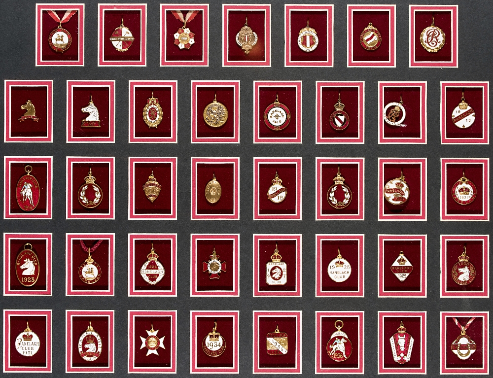 A complete set of Ranelagh Polo Club member's badges 1899 to 1938, 39 gilt-metal & enamel badges individually mounted in chronological order, framed & glazed, 53 by 65cm.