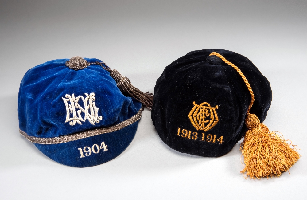 Two sporting caps dated 1904 and 1913-1914, issue unknown, both with elaborate monograms, the later dated example appearing to be a football club F.C.