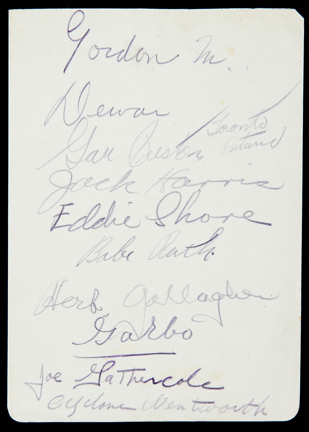 Album page signed by American sportsmen including Babe Ruth, Eddie Shore and Herb Gallagher amongst others, signatures in pencil