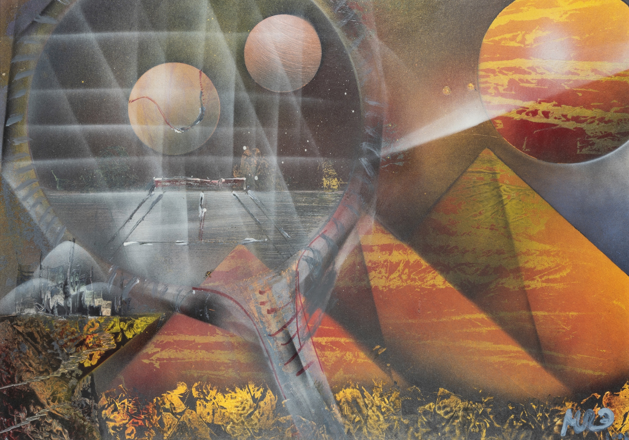 Three abstract science fiction acyrlic paintings signed Miroslav Vlahovic