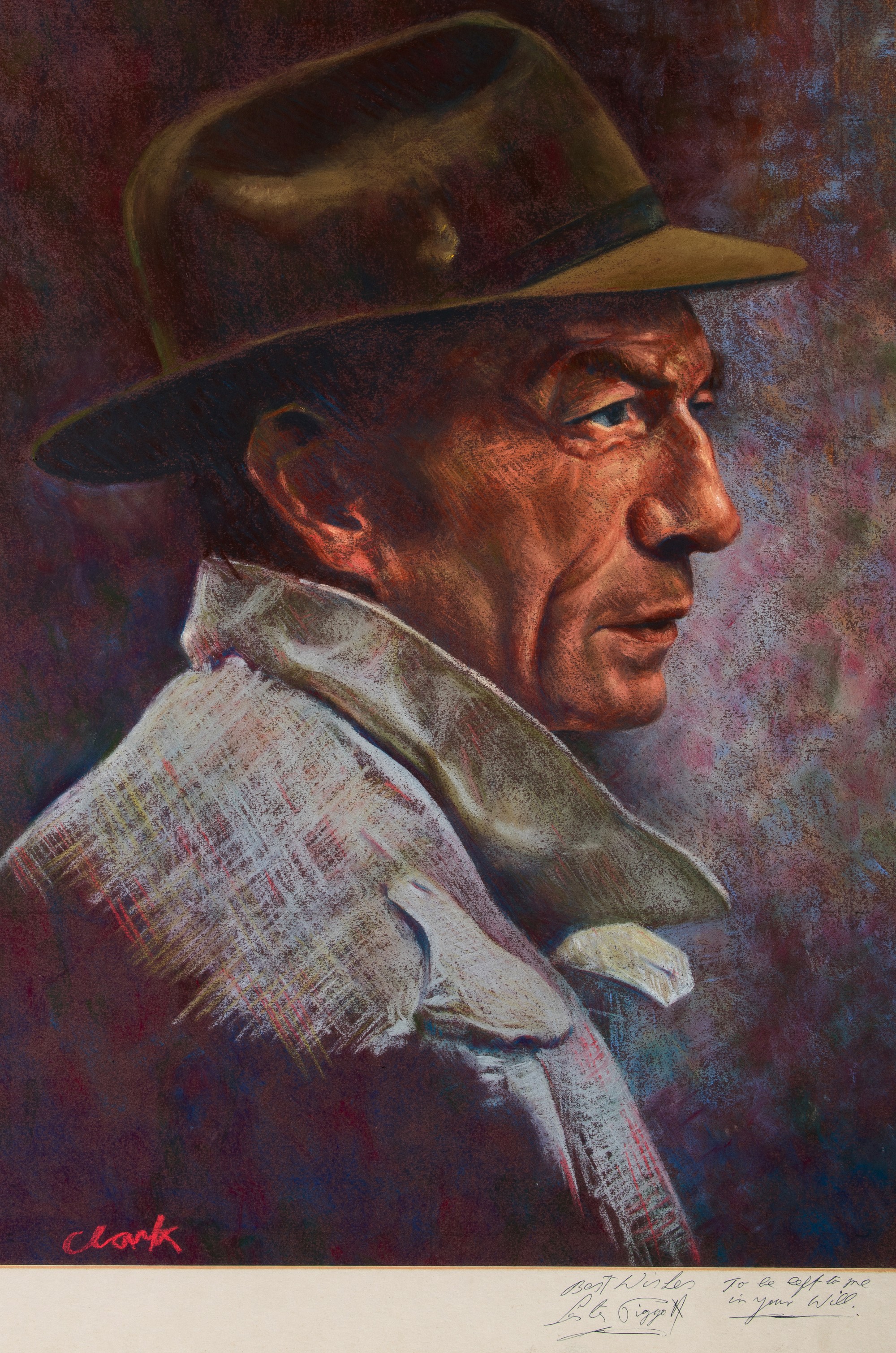 *** Clark (20th century) PORTRAIT OF LESTER PIGGOTT Signed by the artist, coloured pastels, additionally signed by Lester Piggott to the lower mount and also amusingly inscribed in his hand and directed to the artist ''To Be Left To Me In Your Will'', the image 62 by 44cm., framed & glazed