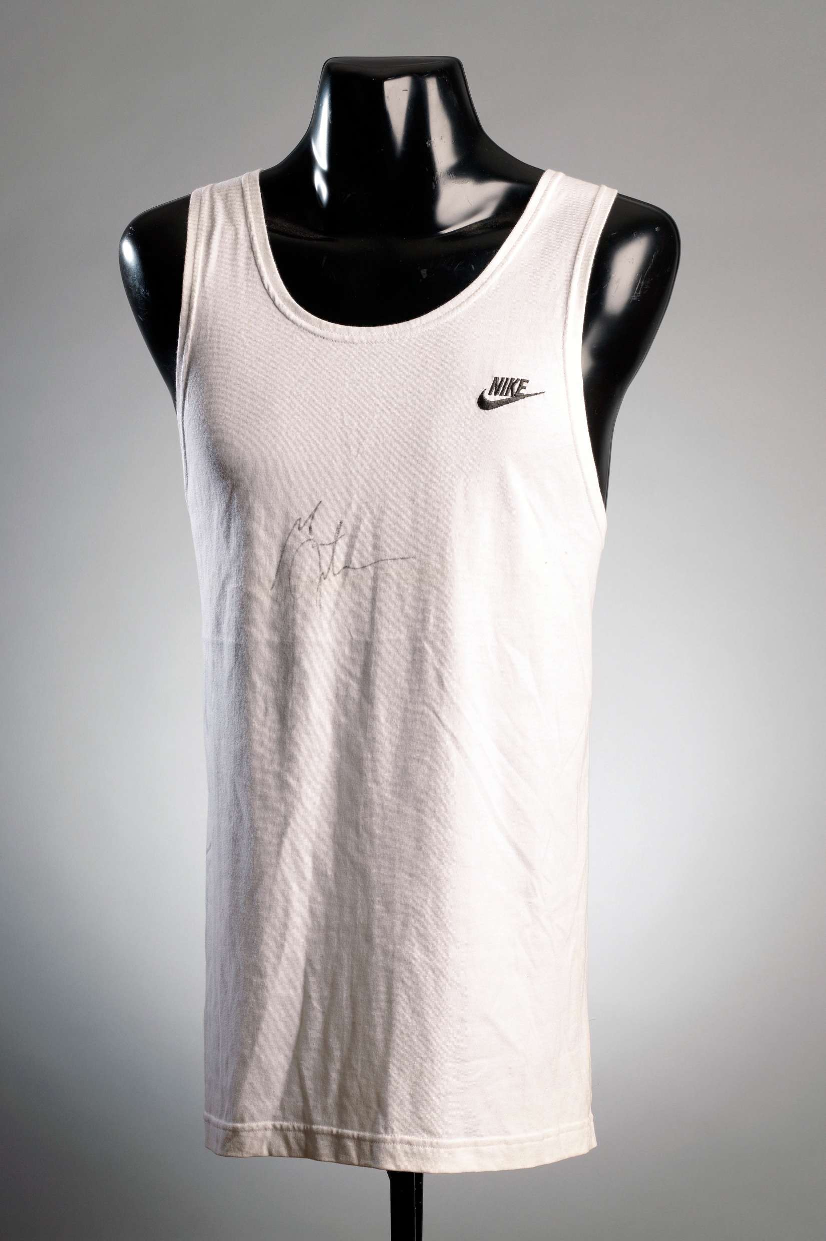 Michael Johnson signed white Nike running vest, signature in black marker pen