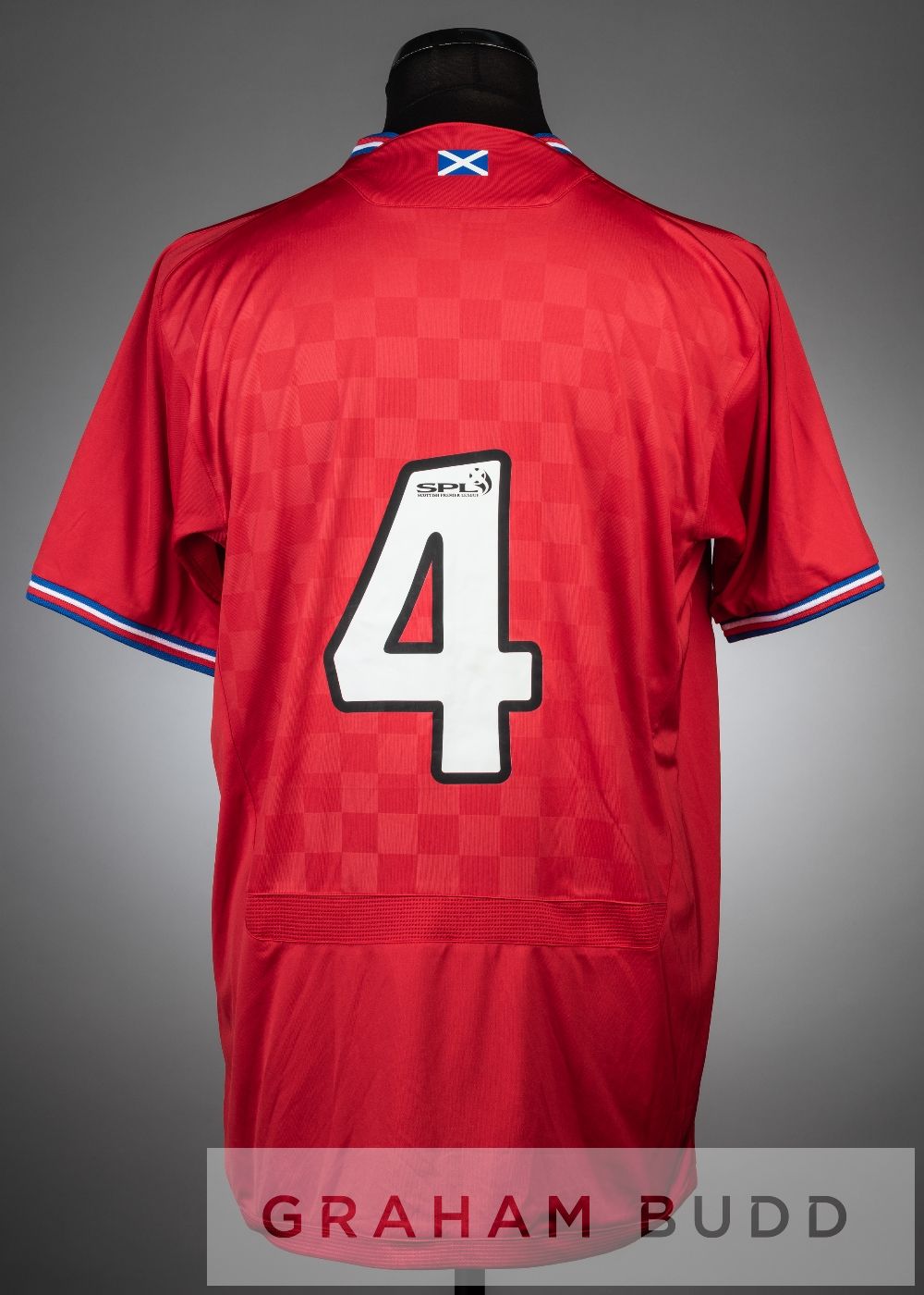 Pedro Mendes signed red, blue and white Rangers no.4 jersey, season 2009-10, short-sleeved with club crest and sponsor logo, reverse numbered 4, signed in black marker pen on front