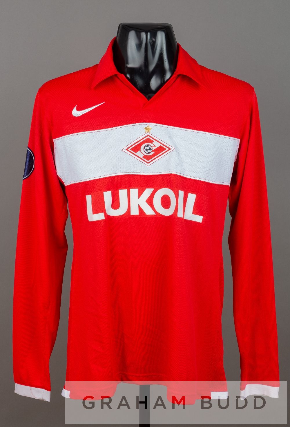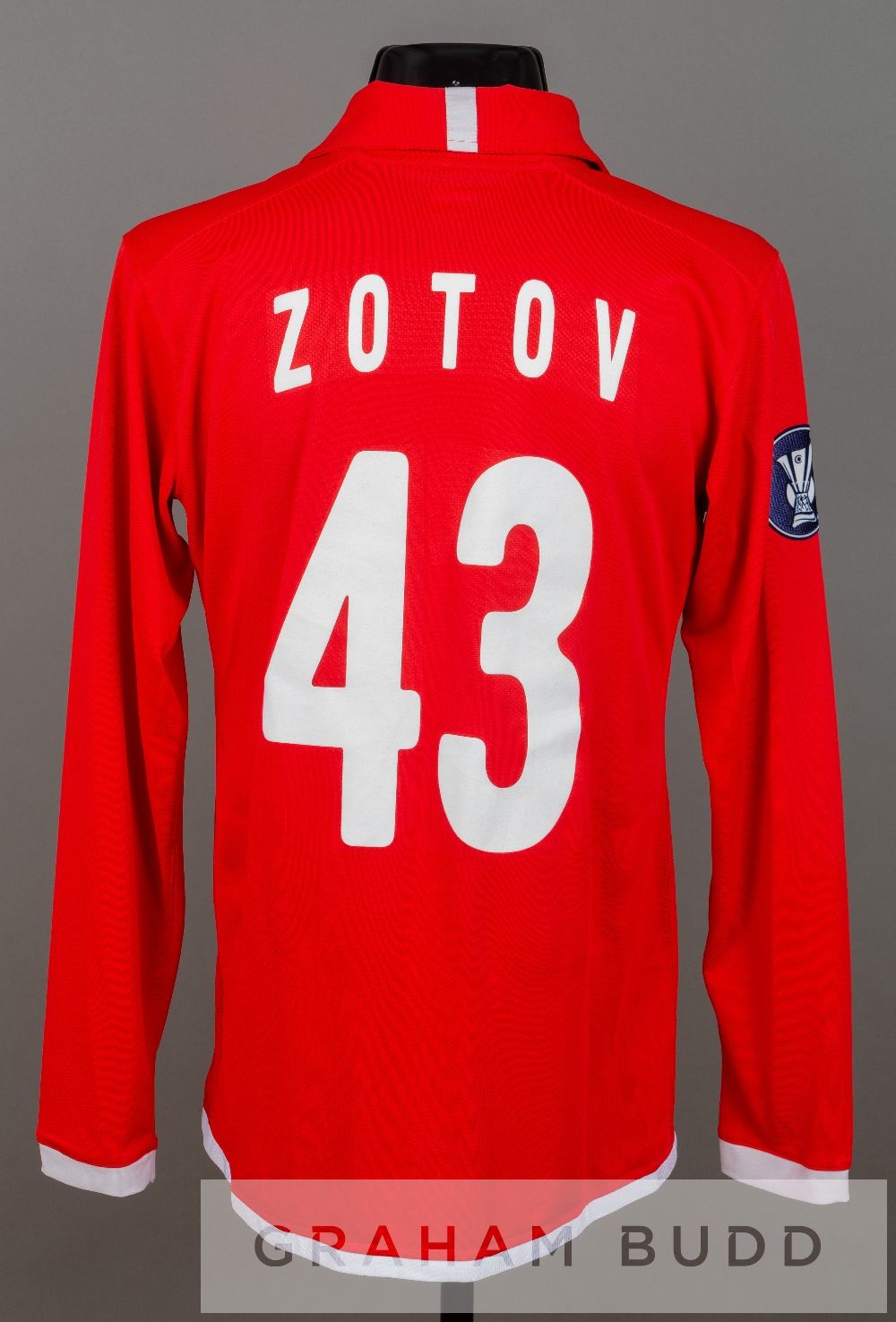 Alelsandr Zotov red Spartak Moscow no.43 jersey v Tottenham Hotspur in the UEFA Cup Group D at White Hart Lane, 18th December 2008, long-sleeved with UEFA CUP sleeve badge, club crest and sponsor logo, reverse lettered ZOTOV This fixture resulted in a 2-2 draw, with Alelsandr Zotov substituted on in the 73rd minute replacing Artur Maloyan.