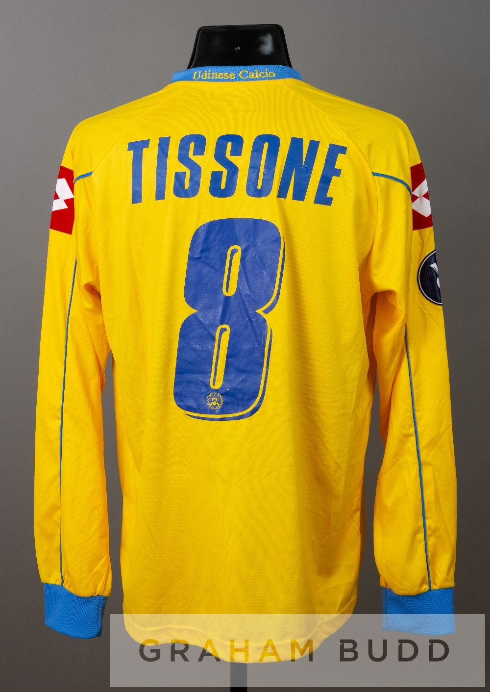 Fernando Tissone yellow Udinese Calico No.8 third-choice away jersey from the UEFA Cup quarter-final 1st Leg at Werder Bremen on 9th April 2009, long-sleeved with LOTTO and UEFA CUP sleeve badges, club crest and sponsor logo, reverse lettered TISSONE, the front logo and reverse lettering and number are both sticky and there is obvious colour transfer to the yellow jersey Fernando Tissone played with Udinese Calico from 2008 to 2009, making five appearances. From the collection of a former Werder Bremen kitman.