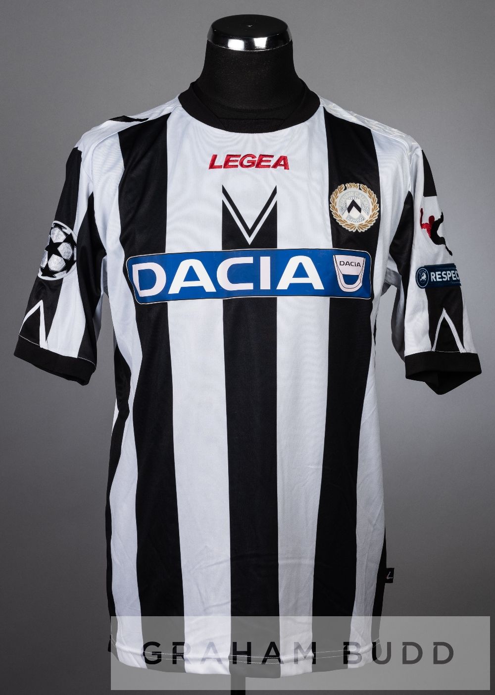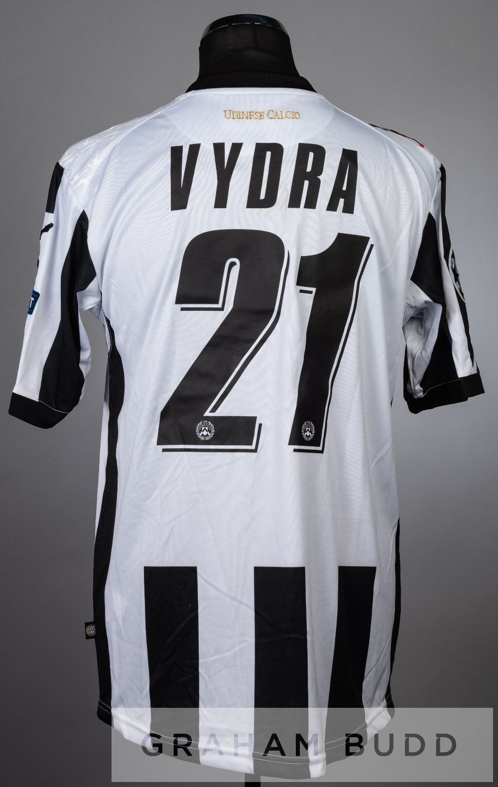 Matej Vydra black and white Udinese no.21 jersey v Arsenal in the UEFA Champions League play-off first leg, at Emirates Stadium, 16th August 2011, short-sleeved with UEFA STARBALL and RESPECT sleeve badges, club crest and sponsor logo, reverse lettered VYDRA Arsenal defeated Udinese 1-0, with Matej Vydra on the substitutes bench.