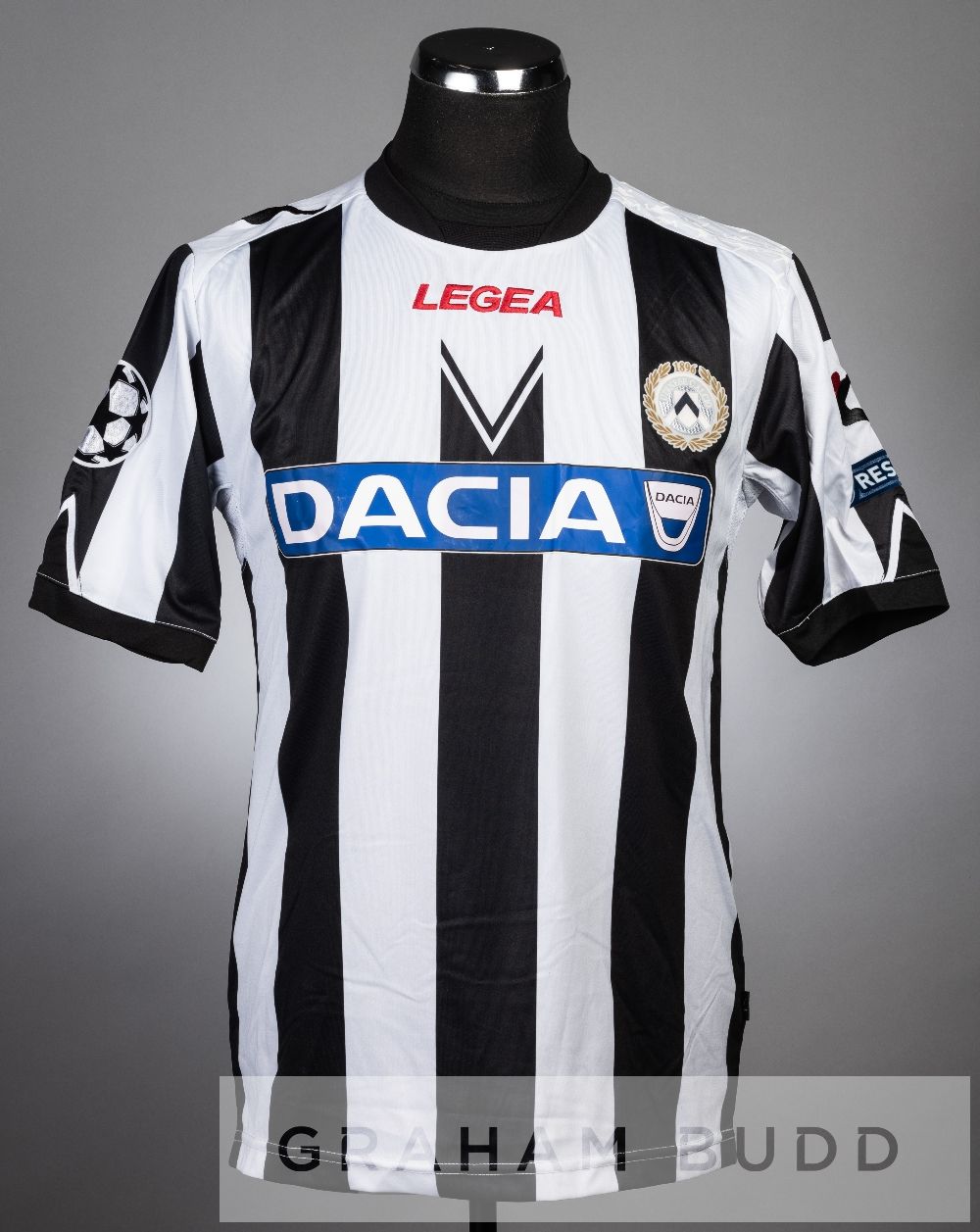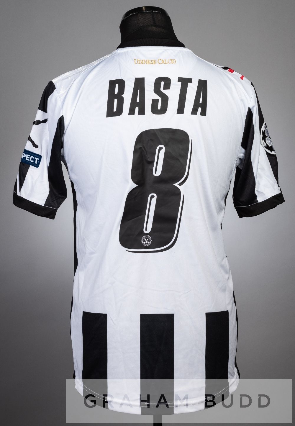 Dusan Basta black and white Udinese no.8 jersey v Arsenal in the UEFA Champions League play-off second leg, at Stadio Friuli, 24th August 2011, short-sleeved with UEFA STARBALL and RESPECT sleeve badges, club crest and sponsor logo, reverse lettered BASTA Arsenal defeated Udinese 2-1, with Dusan Basta on the substitutes bench.