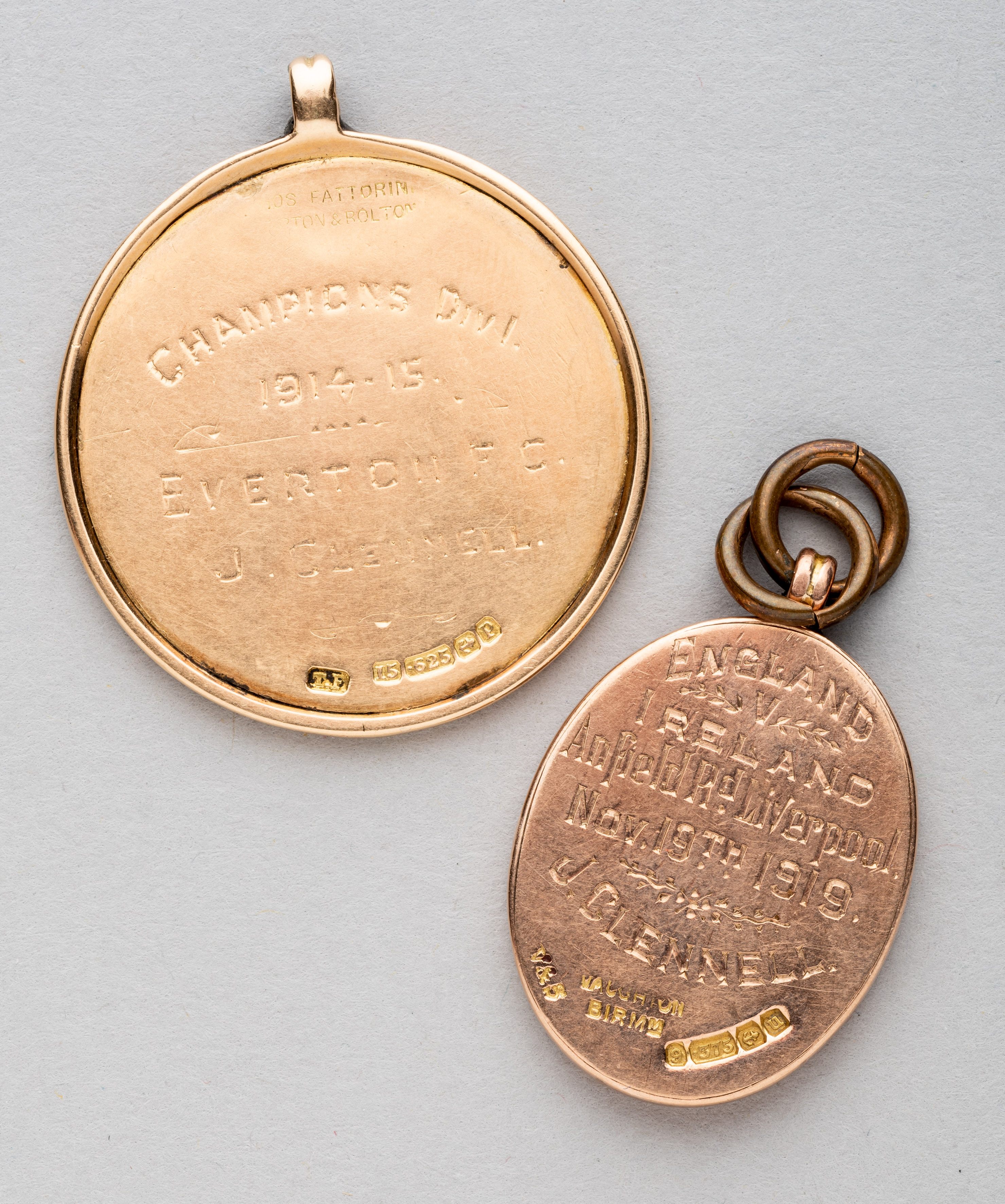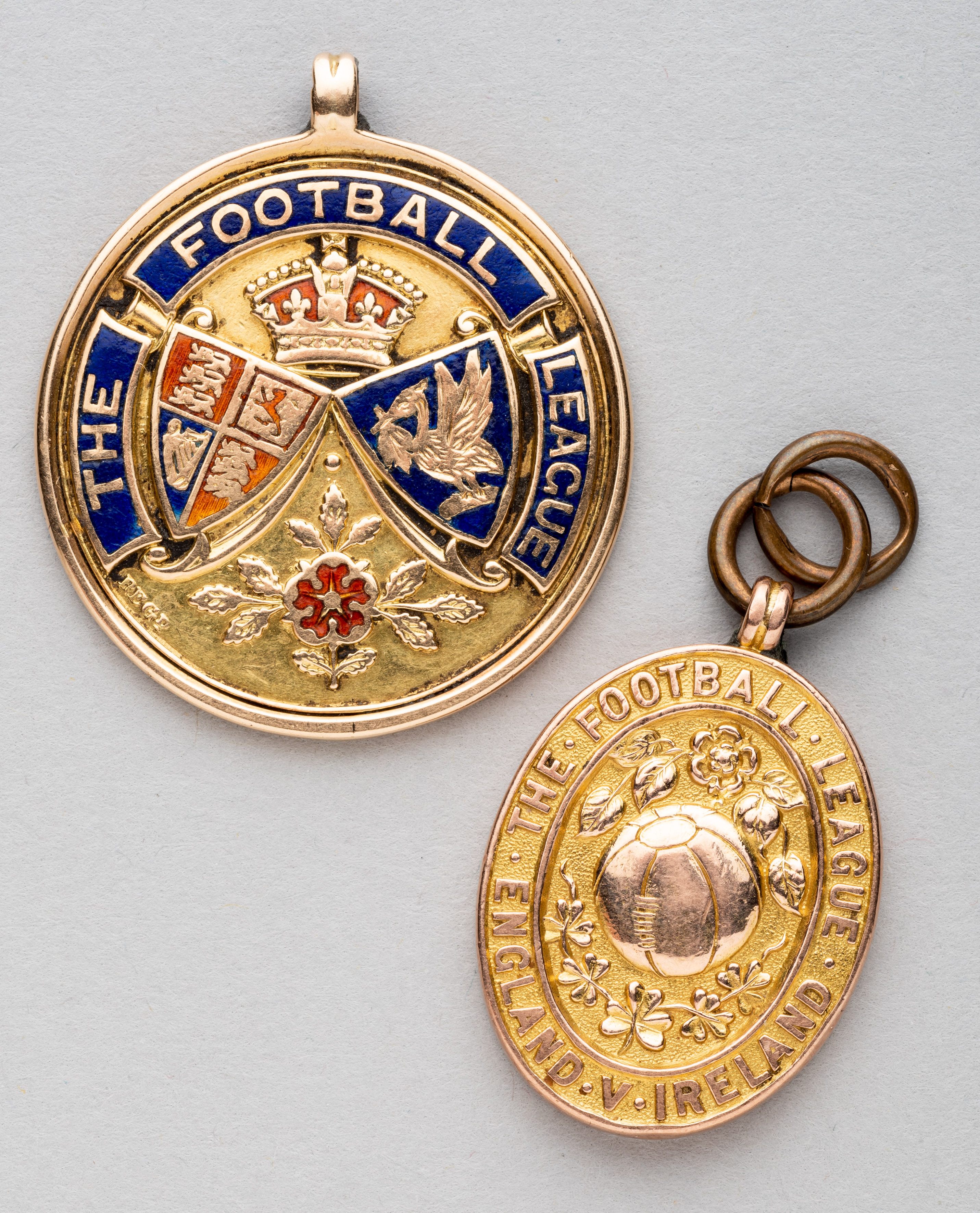Football League representative medal awarded to Everton FC's Joe Clennell for the match v Ireland at Anfield, Liverpool, 19th November 1919, 9ct. gold, Birmingham,1919, by Vaughton & Sons Ltd, obverse inscribed THE FOOTBALL LEAGUE ENGLAND v IRELAND with rose and shamrock emblems, reverse engraved ENGLAND v IRELAND ANFIELD ROD., LIVERPOOL NOV. 19TH 1919, J. CLENNELL, , oval with suspension ring, 30 by 21mm, weight 16gr., with original case with gilt tooled lid THE FOOTBALL LEAGUE.