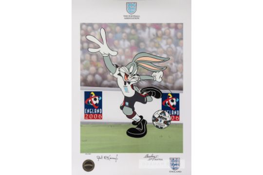 England 2006 FIFA World Cup Bid Bugs Bunny print, signed by artists Robert and Charles McKimson, featuring Bugs Bunny wearing the England team kit kicking a football, with a stadium in the background, signed in black marker pen and bearing THE FOOTBALL ASSOCIATION, ENGLAND and LOONEY TUNES emblems, rolled in tube, 57 by 48cm.