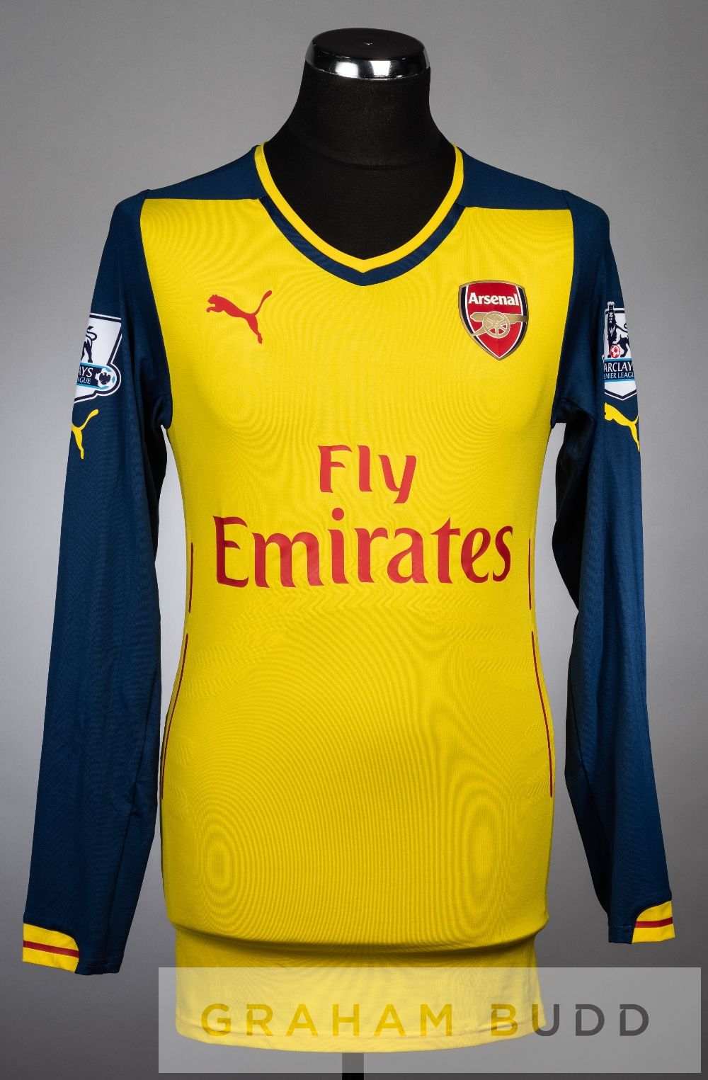 Kieran Gibbs yellow and navy Arsenal no.3 away jersey v Liverpool in the Premier League at Anfield, 21st December 2014, long-sleeved with BARCLAYS PREMIER LEAGUE sleeve badges, club crest and sponsor logo, reverse lettered GIBBS This fixture resulted in a 2-2 draw, with Kieran Gibbs playing in defence/midfield.