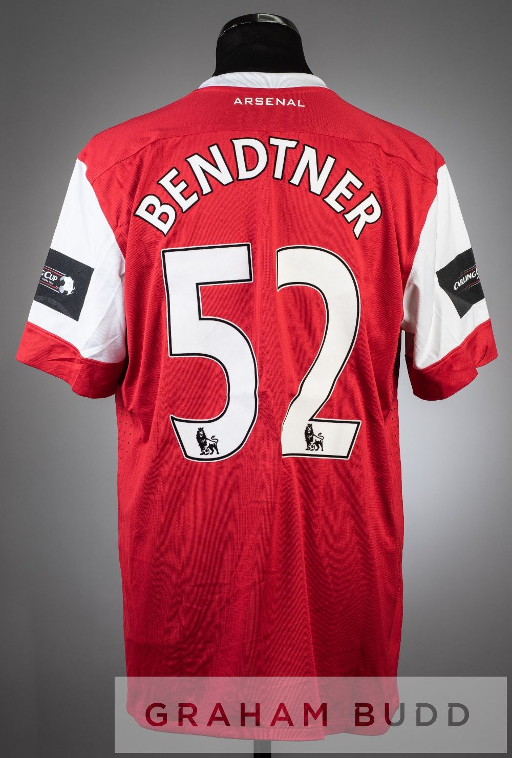 Nicklas Bendtner red and white Arsenal No.52 Carling Cup final jersey v Birmingham City, at Wembley Stadium, on 27th February 2011, short-sleeved, CARLING CUP FINAL 2011 sleeve badges, embroidered CARLING CUP FINAL WEMBLEY 2011, club crest and sponsor logo, reverse lettered BENDTNER, slight stains to numbers on reverse Birmingham City defeated Arsenal 2-1, with Bendtner substituted on in the 69th minute, replacing Robin van Persie Arsenals goal scorer.Nicklas Bendter played for Arsenal from 2005 to 2014, making 108 appearances, scoring 24 goals.