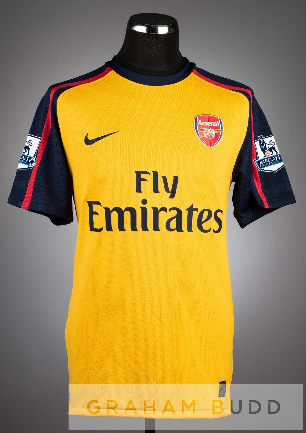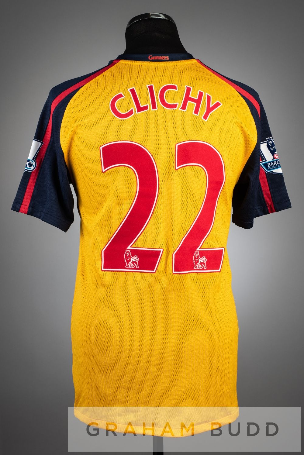 Gael Clichy gold and navy Arsenal No.22 away jersey, season 2008-09, short-sleeved, with BARCLAYS PREMIER LEAGUE sleeve badges, with club crest and sponsor logo, reverse lettered CLICHY, size M Gael Clichy played for Arsenal from 2003 to 2011, making 187 appearances, scoring one goal.