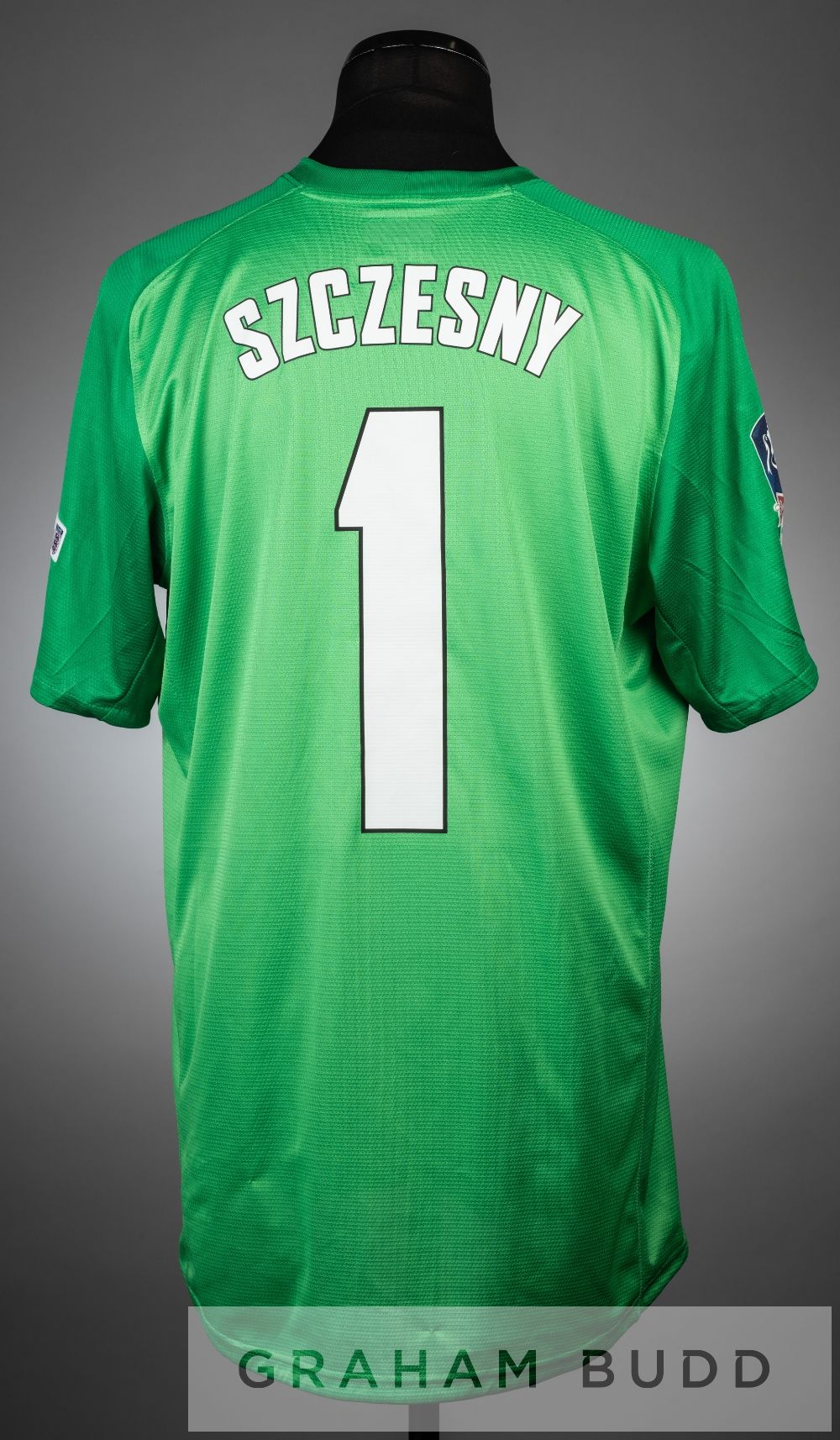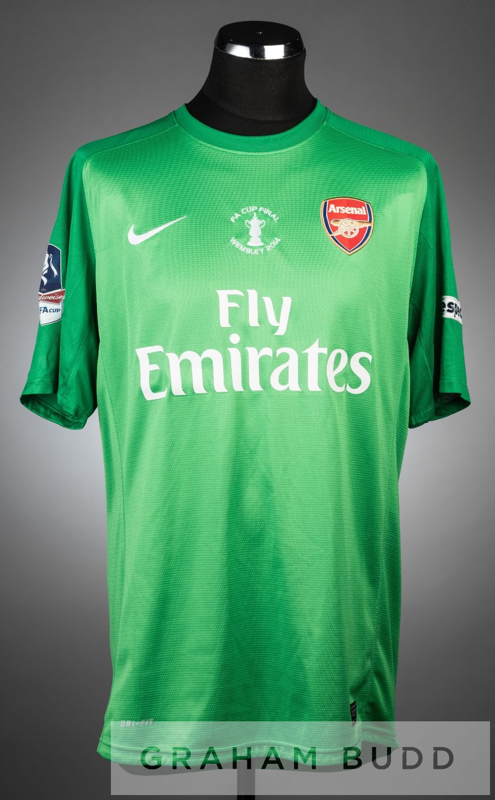 Wojciech Szczesny green Arsenal no.1 goalkeeper's jersey v Hull City in the FA cup Final at Wembley, 17th May 2014, short-sleeved with THE FA CUP and RESPECT sleeve badges, embroidered FA CUP FINAL WEMBLEY 2014, club crest and sponsor logo, reverse lettered SZCZESNY Arsenal defeated Hull City 3-2, with Wojciech Szczesny on the substitute's bench.