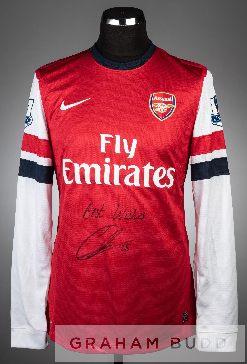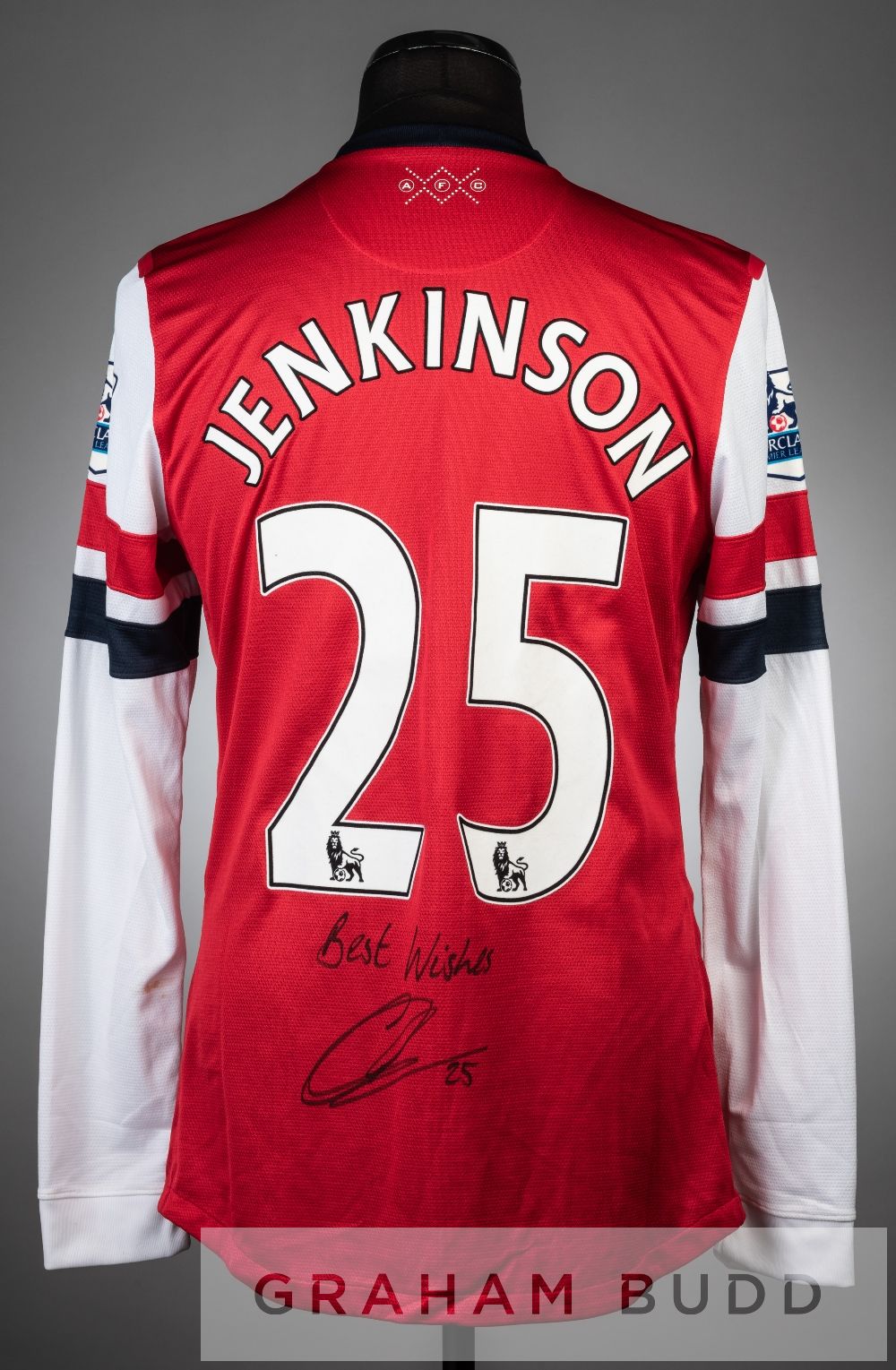 Carl Jenkinson double signed red and white Arsenal no.25 home jersey, season 2012-13, long-sleeved with BARCLAYS PREMIER LEAGUE sleeve badges, club crest and sponsor logo, reverse lettered JENKINSON, signed in black marker pen on reverse and front, rubber shoulder seams tacky and bears marks on sleeves