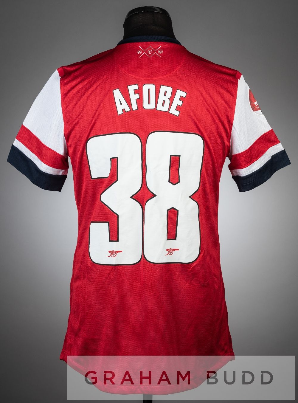 Benik Afobe red and white Arsenal no.38 home jersey v Kitchee in the pre-season friendly at Hong Kong Stadium, 29th July 2012, short-sleeved with ARSENAL TOUR 2012 HONG KONG sleeve badge, club crest and sponsor logo, reverse lettered AFOBE, rubber shoulder seams tacky This fixture resulted in a 2-2 draw.