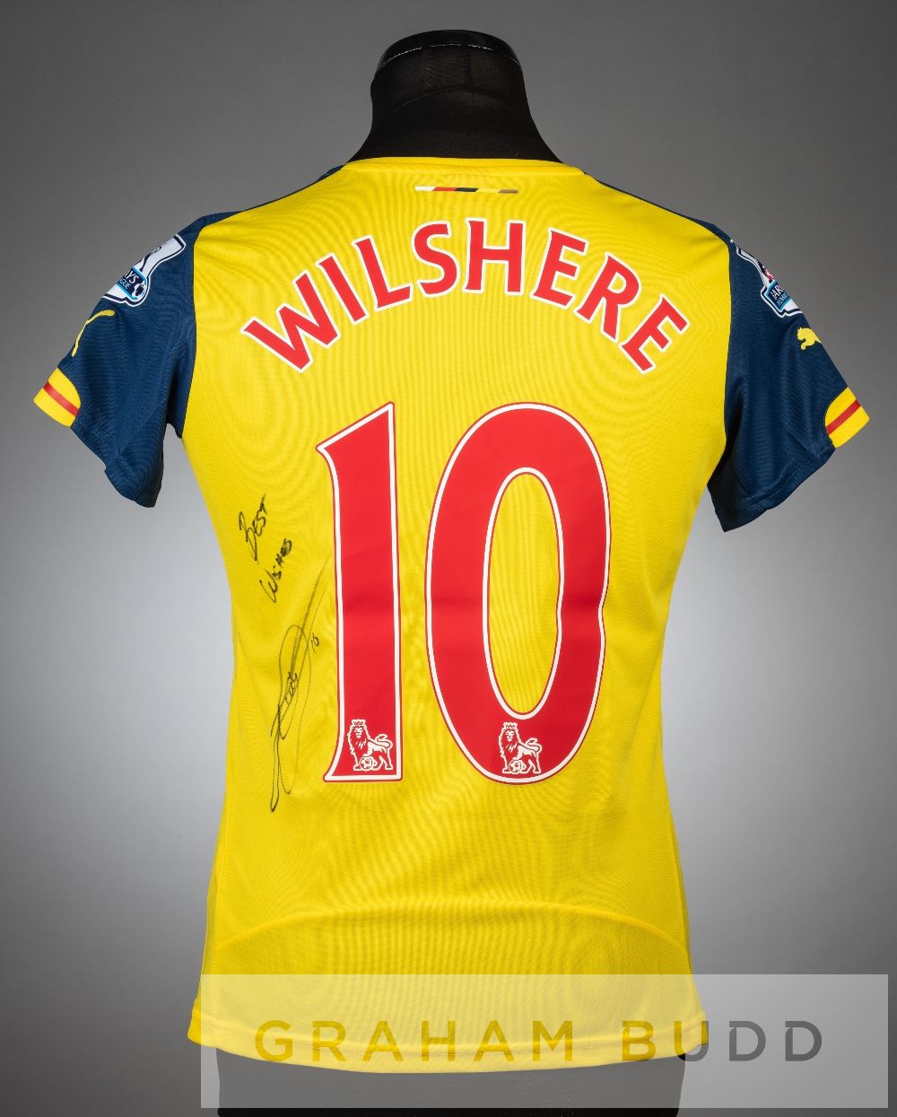 Jack Wilshere signed yellow and navy Arsenal no.10 away jersey, season 2014-15, short-sleeved with BARCLAYS PREMIER LEAGUE sleeve badges, club crest and sponsor logo, reverse lettered WILSHERE, signed in black marker pen to reverse Re-catalogued under item 32 for March 2022 GB46